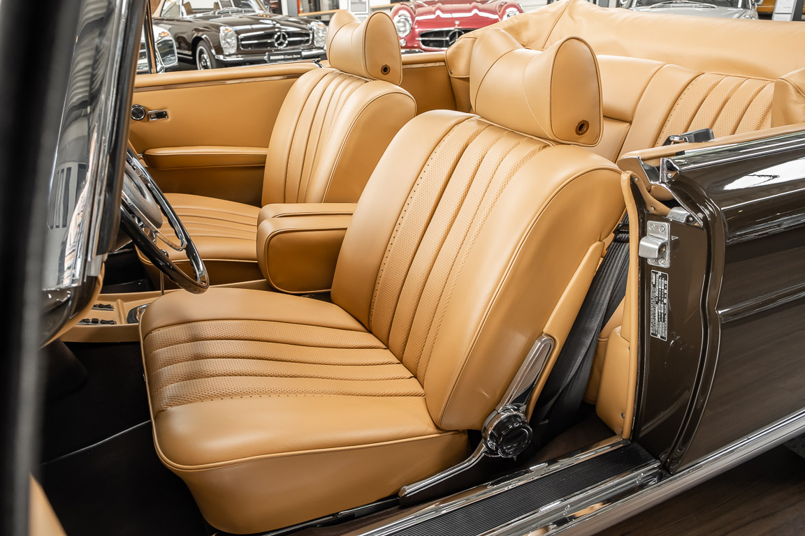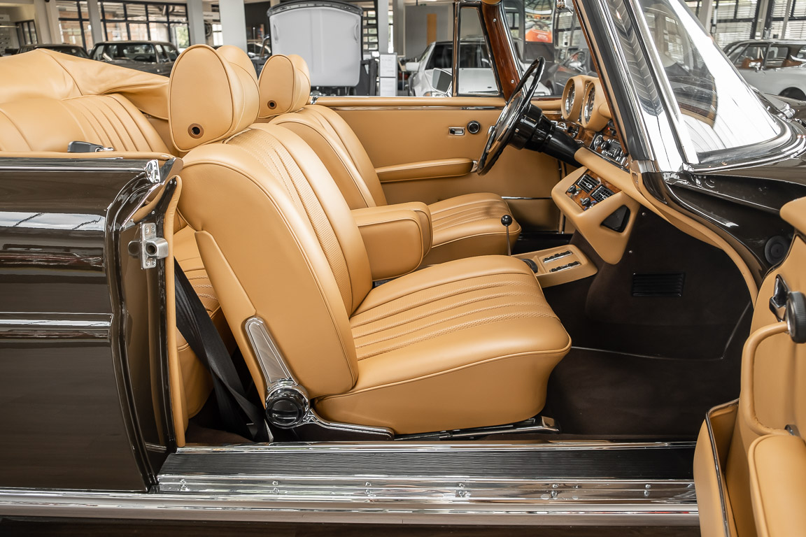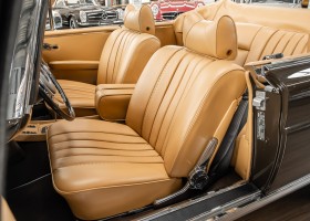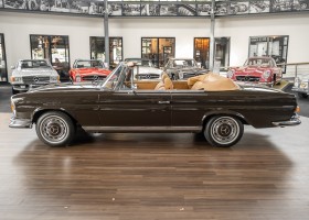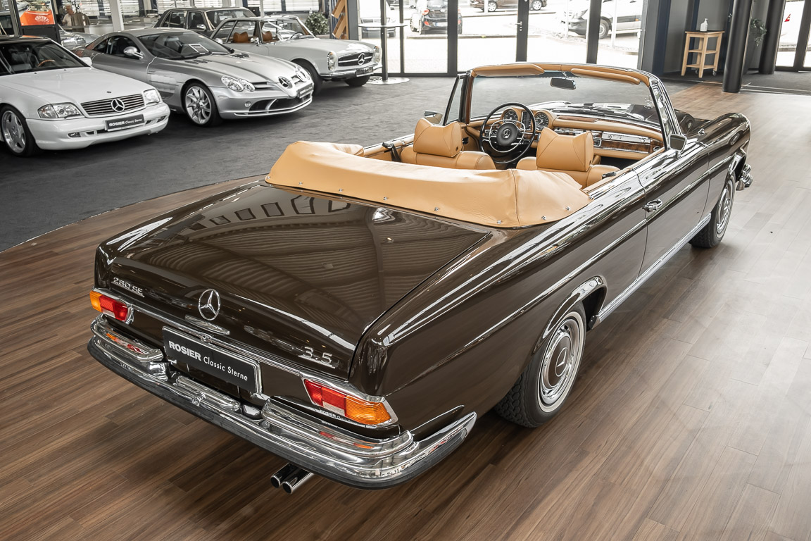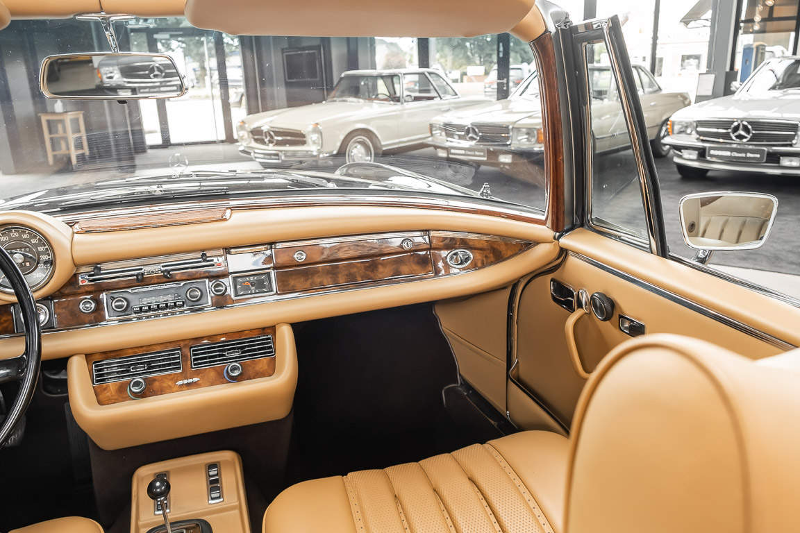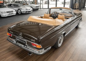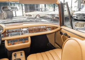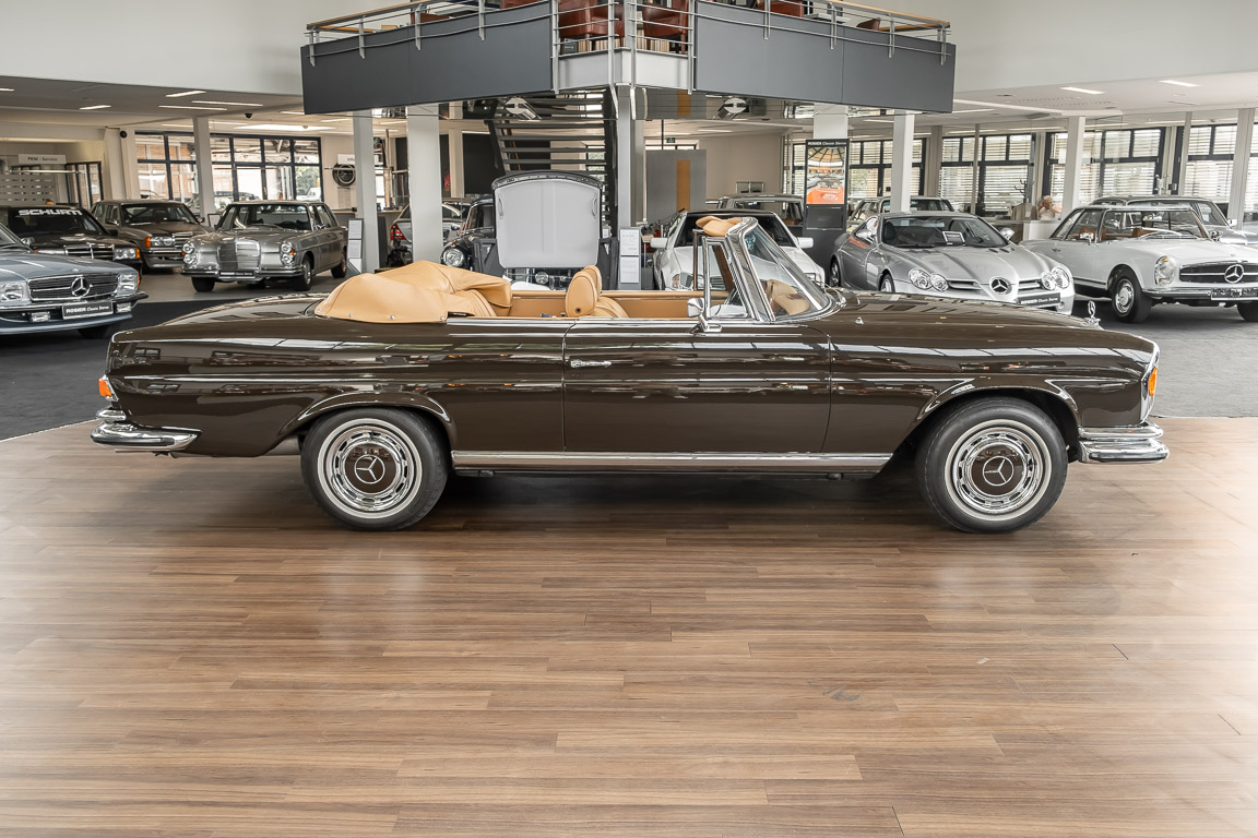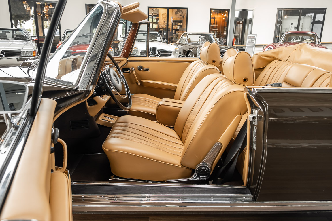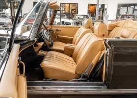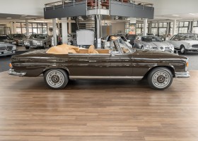 Dieses elegante 280SE 3.5 Liter Cabriolet wurde im Frühjahr 1971 bei Mercedes-Benz in Deutschland fertiggestellt und nach South Carolina/USA verschifft. Die Ausstattung war exzellent und umfasste ein Becker Radio, Klimaanlage aus dem Hause BEHR und Automatik Getriebe mit Mittelschaltung. Der Erstbesitzer hatte den Wagen in elegantem Tabakbraun in Verbindung mit cognacfarbenem Lederinterieur geordert, das mit der dunkelbraunen Wurzelholzausführung des  Armaturenbretts besonders harmoniert. Das elegante Cabriolet blieb lange Jahre in South Carolina und fand in 2012 seinen Weg nach Georgia/USA. Von dort kam der Wagen in 2014 nach Deutschland und wurde über die Mercedes-Benz Niederlassung in Hannover an seinen bisherigen Besitzer verkauft. Der Wagen wurde sorgfältig überarbeitet und erhielt in diesem Zug eine neue Lederausstattung in feinster Qualität. Sie unterstreicht eindrucksvoll die schier unendliche Eleganz dieses 280 SE 3.5 Liter Cabriolets. Machen Sie sich am besten selbst ein Bild in unseren Räumlichkeiten, Sie werden begeistert sein.