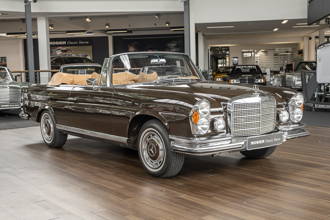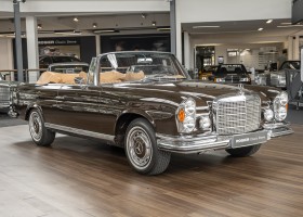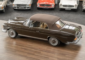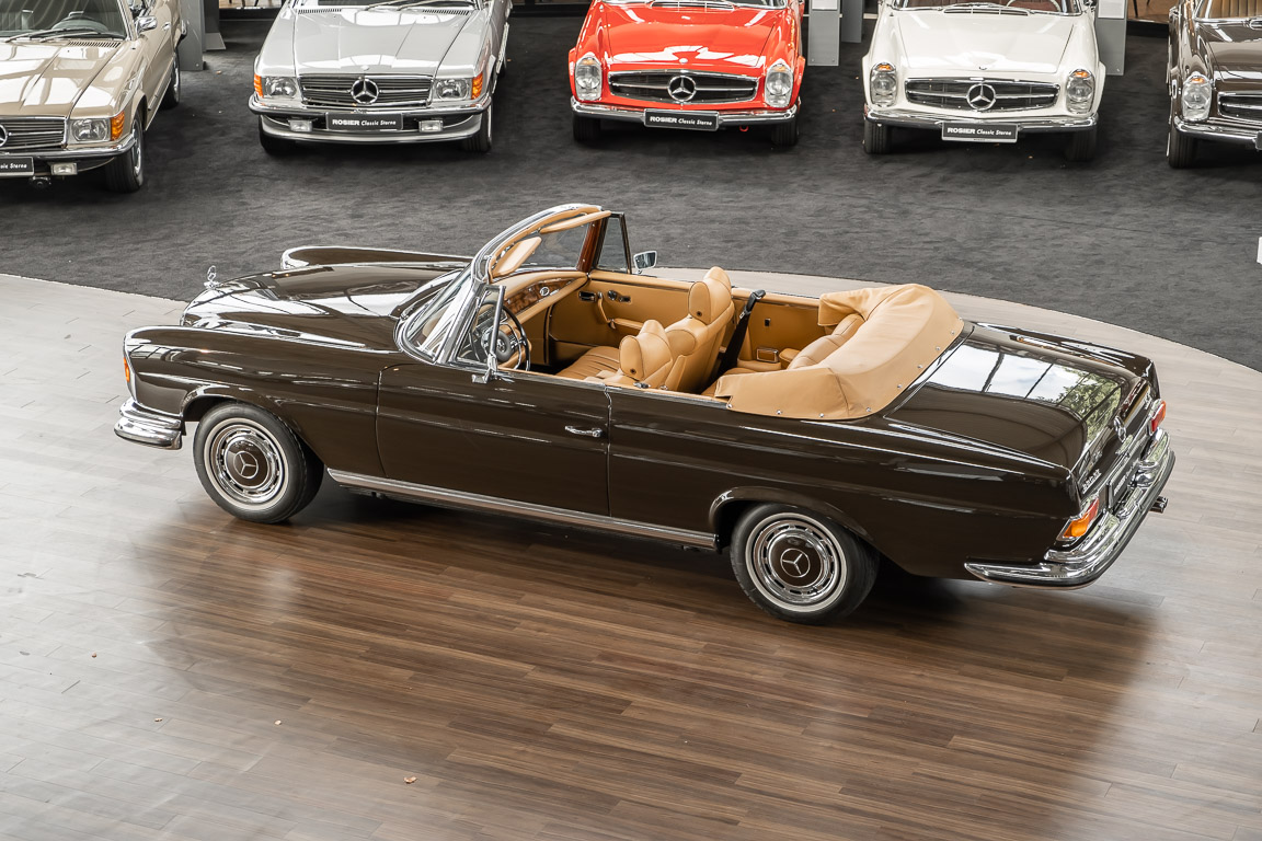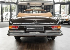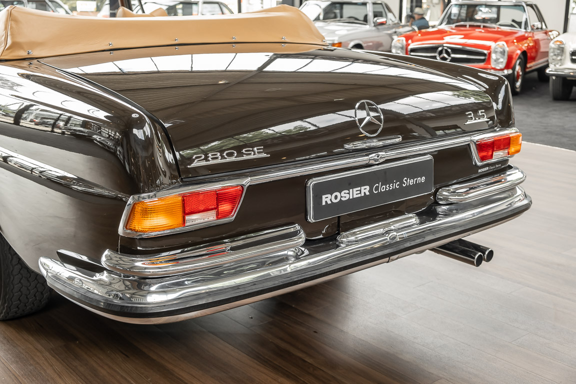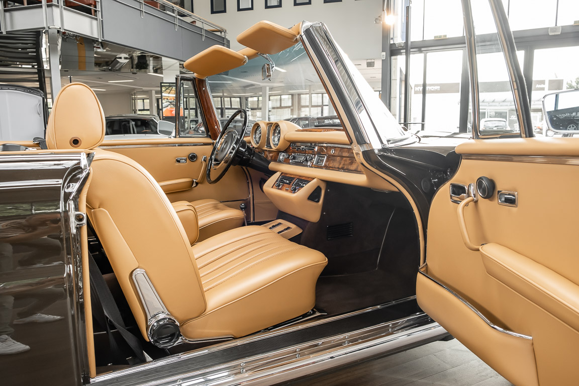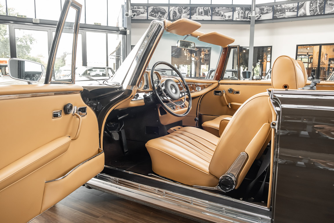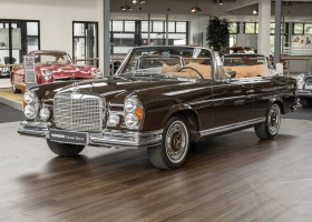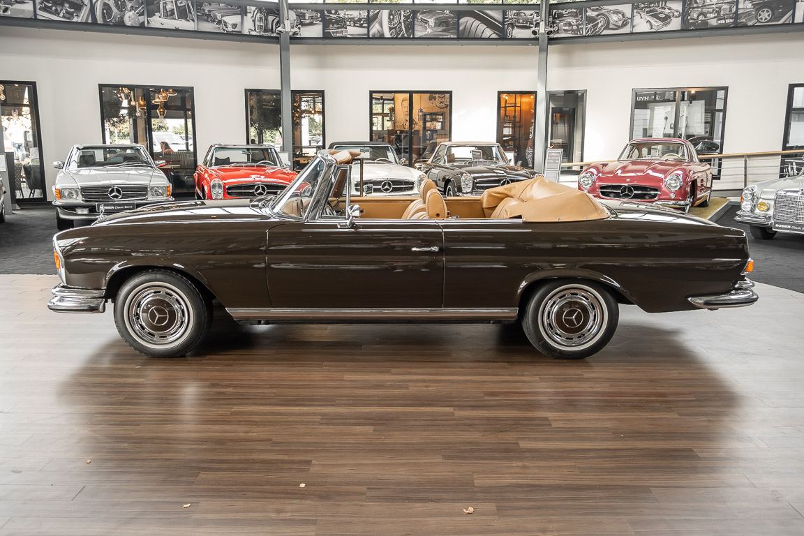 Dieses elegante 280SE 3.5 Liter Cabriolet wurde im Frühjahr 1971 bei Mercedes-Benz in Deutschland fertiggestellt und nach South Carolina/USA verschifft. Die Ausstattung war exzellent und umfasste ein Becker Radio, Klimaanlage aus dem Hause BEHR und Automatik Getriebe mit Mittelschaltung. Der Erstbesitzer hatte den Wagen in elegantem Tabakbraun in Verbindung mit cognacfarbenem Lederinterieur geordert, das mit der dunkelbraunen Wurzelholzausführung des  Armaturenbretts besonders harmoniert. Das elegante Cabriolet blieb lange Jahre in South Carolina und fand in 2012 seinen Weg nach Georgia/USA. Von dort kam der Wagen in 2014 nach Deutschland und wurde über die Mercedes-Benz Niederlassung in Hannover an seinen bisherigen Besitzer verkauft. Der Wagen wurde sorgfältig überarbeitet und erhielt in diesem Zug eine neue Lederausstattung in feinster Qualität. Sie unterstreicht eindrucksvoll die schier unendliche Eleganz dieses 280 SE 3.5 Liter Cabriolets. Machen Sie sich am besten selbst ein Bild in unseren Räumlichkeiten, Sie werden begeistert sein.