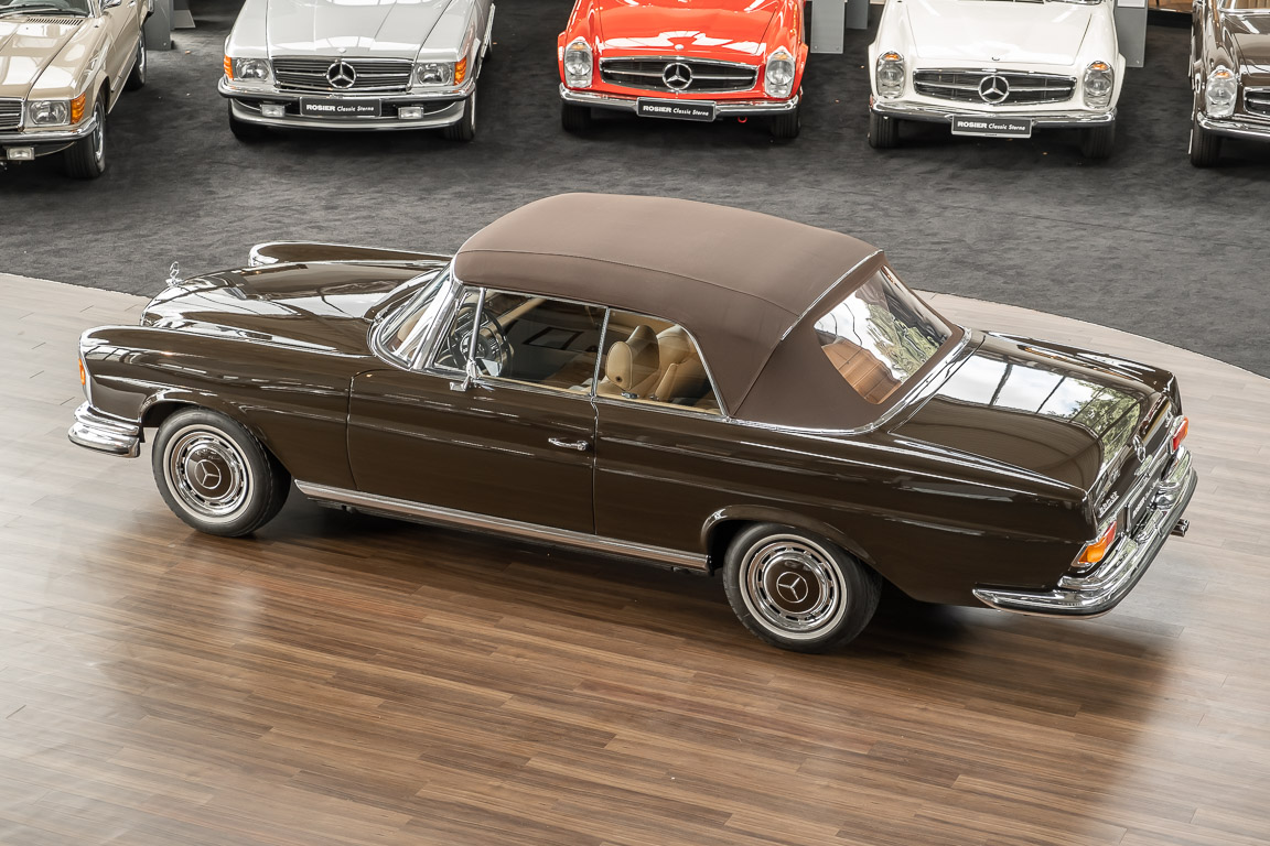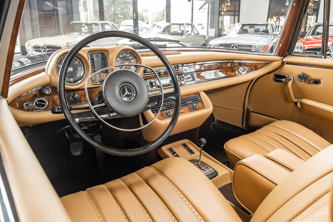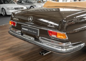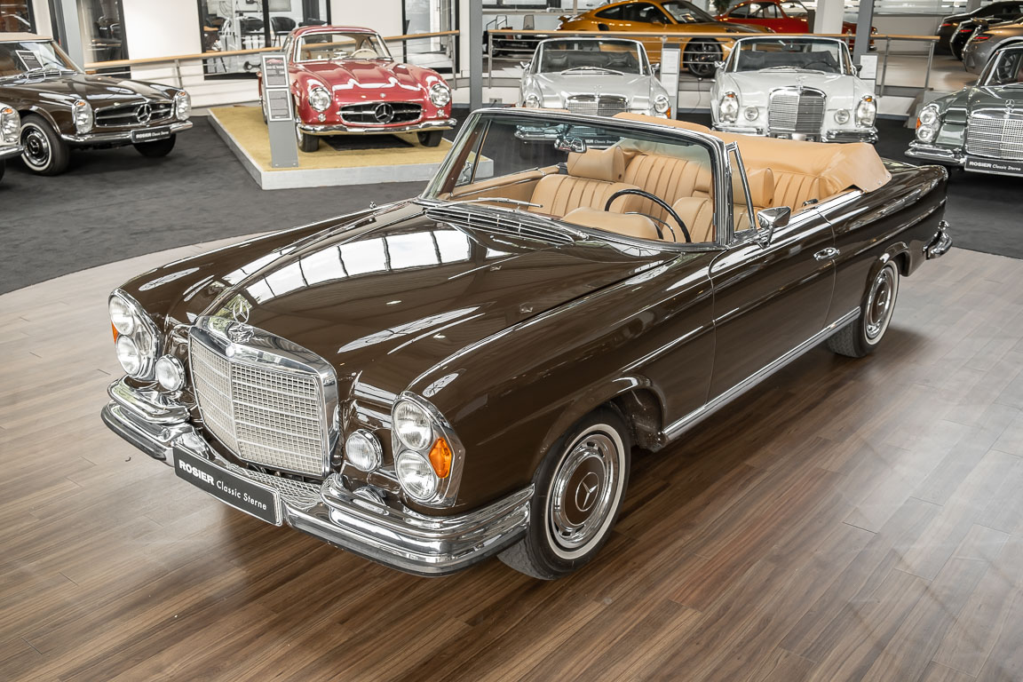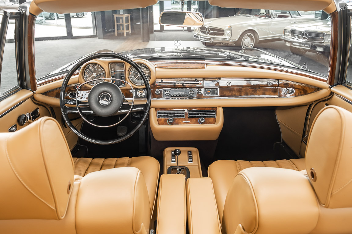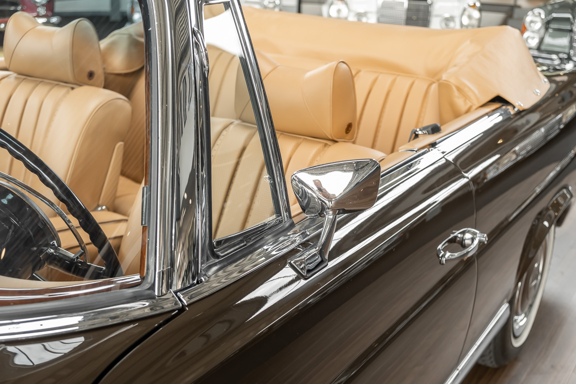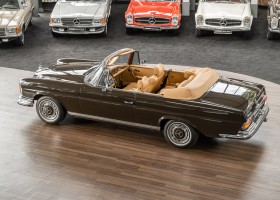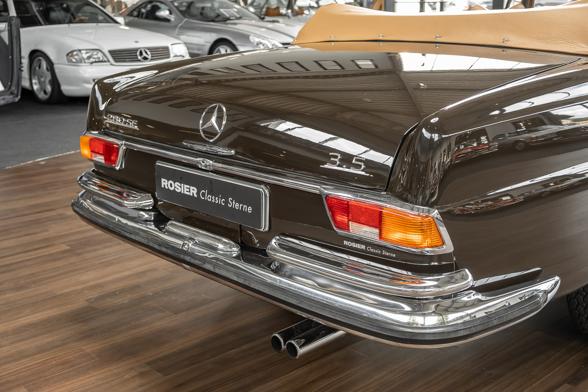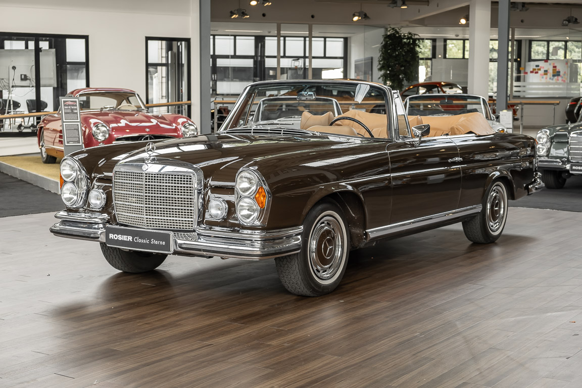 Dieses elegante 280SE 3.5 Liter Cabriolet wurde im Frühjahr 1971 bei Mercedes-Benz in Deutschland fertiggestellt und nach South Carolina/USA verschifft. Die Ausstattung war exzellent und umfasste ein Becker Radio, Klimaanlage aus dem Hause BEHR und Automatik Getriebe mit Mittelschaltung. Der Erstbesitzer hatte den Wagen in elegantem Tabakbraun in Verbindung mit cognacfarbenem Lederinterieur geordert, das mit der dunkelbraunen Wurzelholzausführung des  Armaturenbretts besonders harmoniert. Das elegante Cabriolet blieb lange Jahre in South Carolina und fand in 2012 seinen Weg nach Georgia/USA. Von dort kam der Wagen in 2014 nach Deutschland und wurde über die Mercedes-Benz Niederlassung in Hannover an seinen bisherigen Besitzer verkauft. Der Wagen wurde sorgfältig überarbeitet und erhielt in diesem Zug eine neue Lederausstattung in feinster Qualität. Sie unterstreicht eindrucksvoll die schier unendliche Eleganz dieses 280 SE 3.5 Liter Cabriolets. Machen Sie sich am besten selbst ein Bild in unseren Räumlichkeiten, Sie werden begeistert sein.