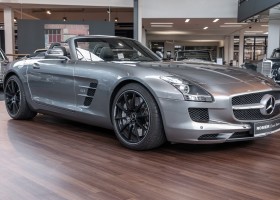 Dieser wundervolle SLS AMG Roadster im so beliebten Farbton Himalayas Grey Middle Metallic in Kombination mit Schwarzen AMG Schmiederädern macht bereits im Stand eine athletische Figur. Ein Eindruck, der sich spätestens beim Starten des brachialen 6,3l-Achtzylinders bestätigt – vor allem bei geöffnetem Verdeck.
