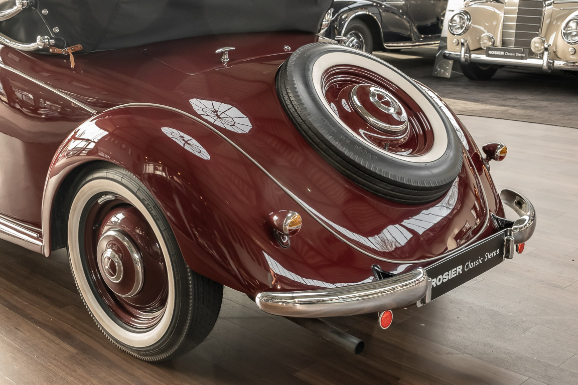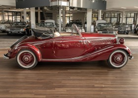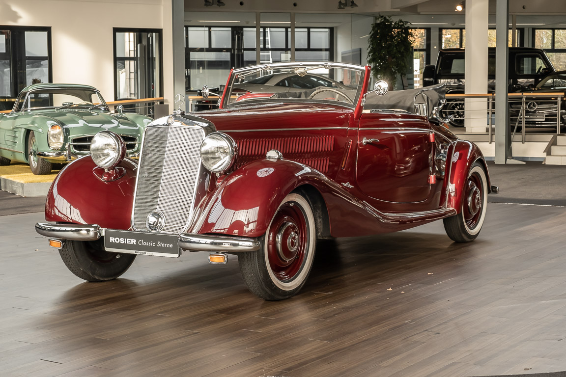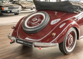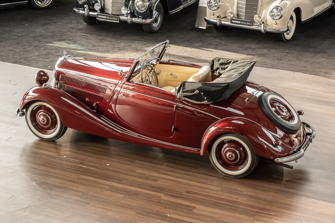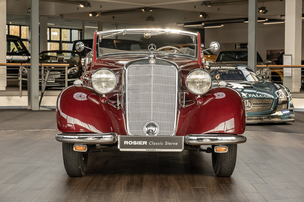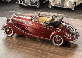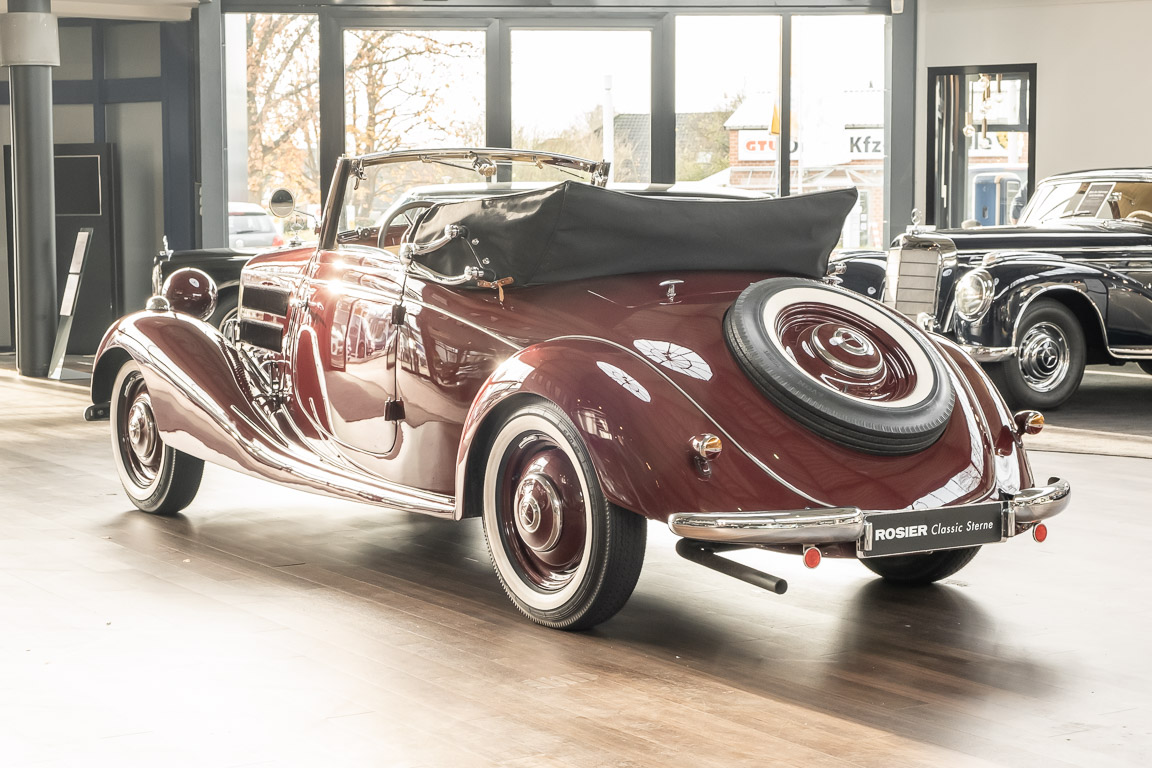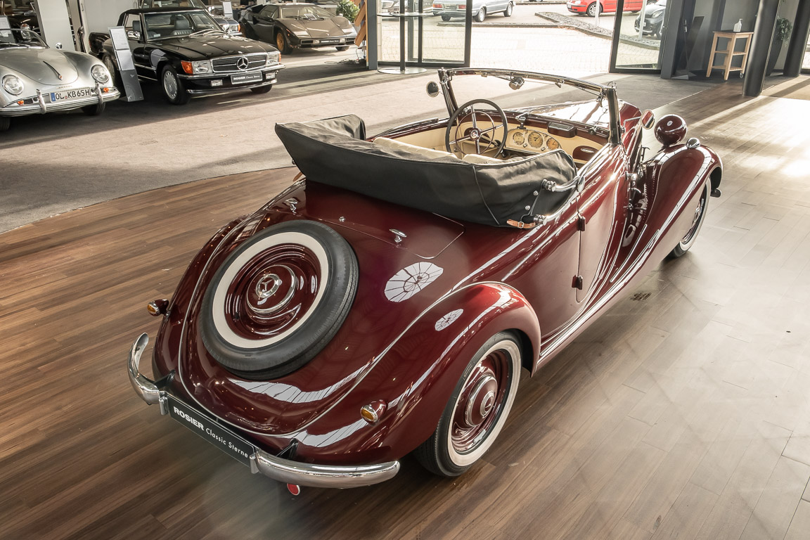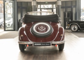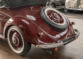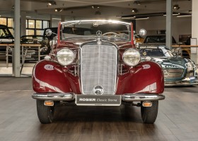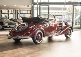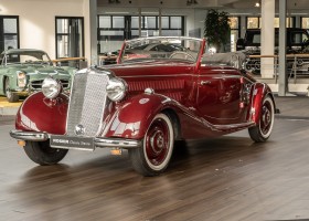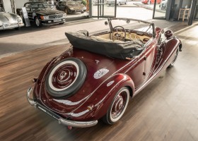 This Mercedes-Benz 170V Cabriolet A from 1938 is a convertible dream with a great history. The car was delivered to Jürgen Voigts in Voigtsgrund in the Gibeon district in October 1938 via the Metje + Ziegler dealership in Windhoek, Namibia, which still exists today. At that time, the farm of the respected German-born Voigts family already covered 160,000 hectares of mostly private land and was known for its herds of 17,000 Karakul sheep. The wagon remained in Namibia during the war years and only returned to Germany after the war. It found its home in the Munich area and in the mid-1960s belonged to the actor Danilo Zschauer from Munich, among others, as can be seen from the original cardboard letter. On August 25, 1978, the convertible came into the possession of a highly successful entrepreneur in the Märkischer Kreis district of North Rhine-Westphalia, according to the original purchase contract available to us. He took excellent care of the car and maintained it, but decided in the mid-1980s to carry out a complete restoration. The restoration was of such quality that even today, many years later, the car presents itself in almost immaculate condition. It invites you to take stylish trips through picturesque landscapes with endless convertible pleasure.
