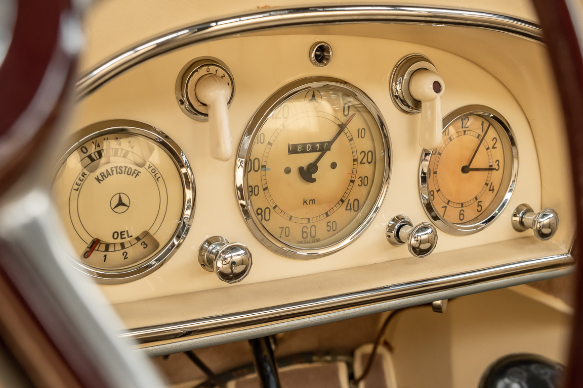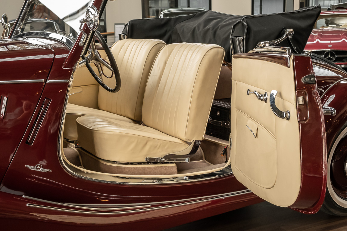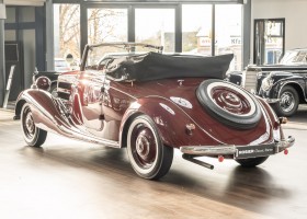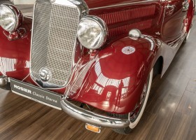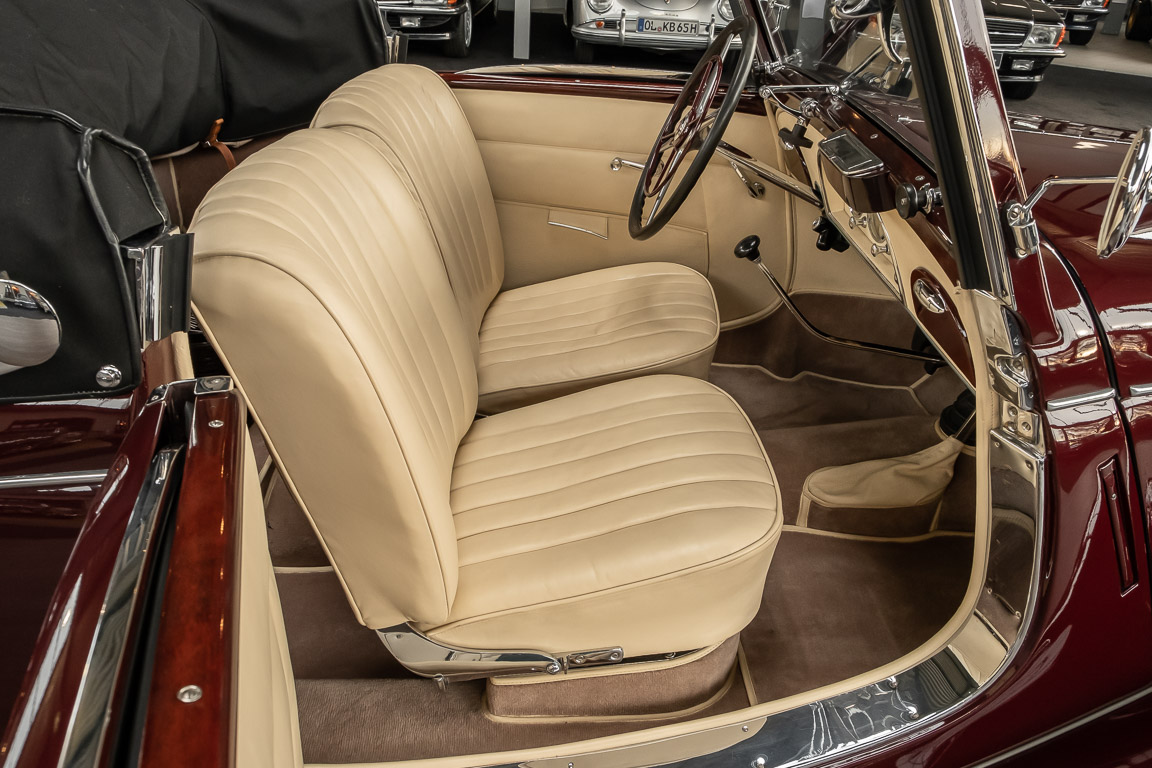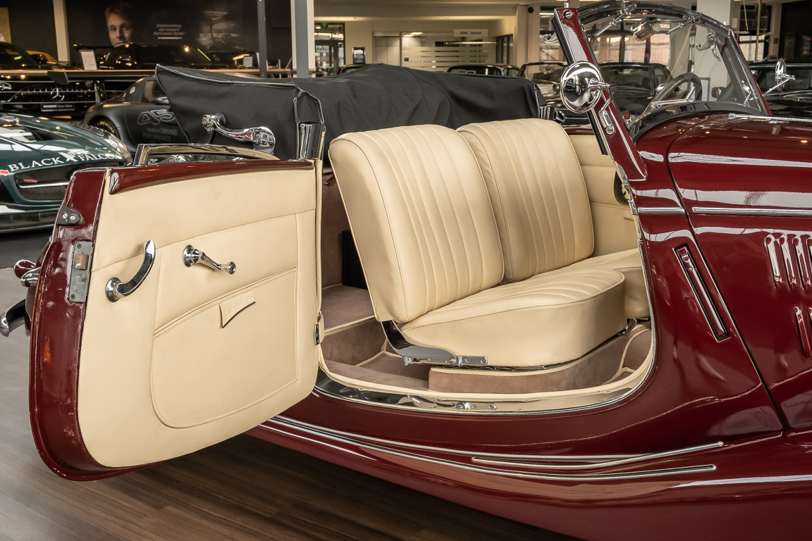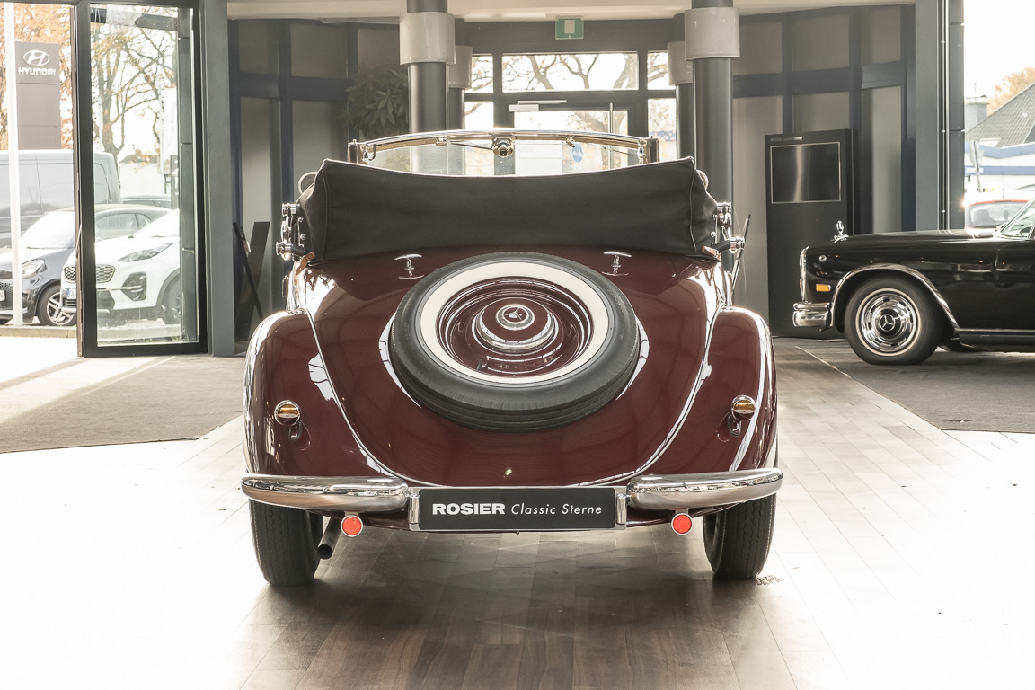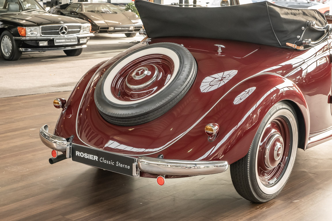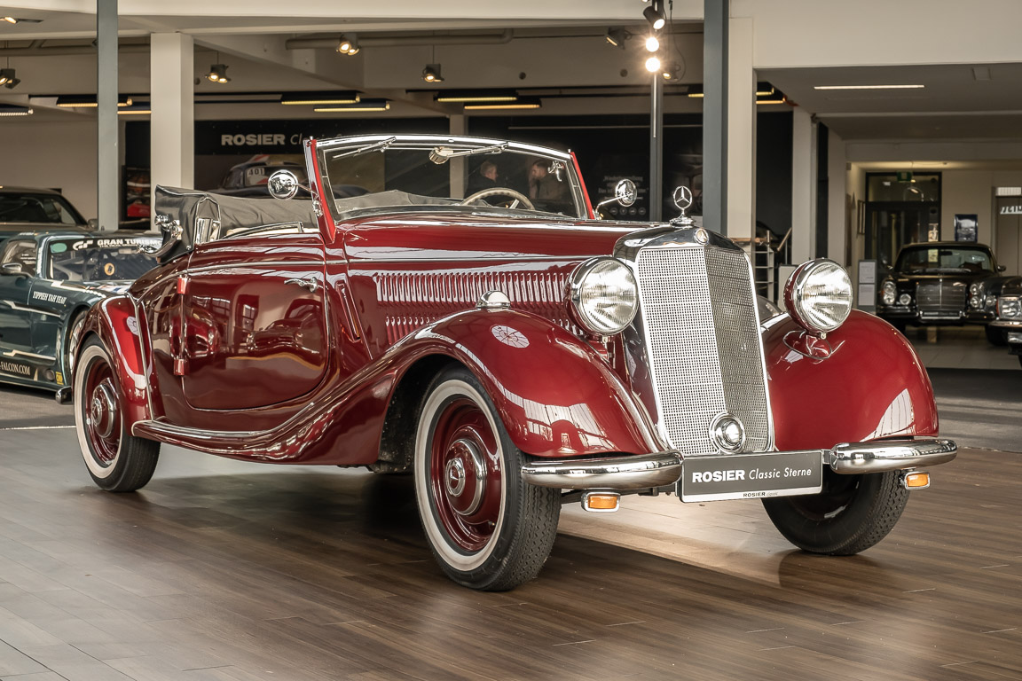 This Mercedes-Benz 170V Cabriolet A from 1938 is a convertible dream with a great history. The car was delivered to Jürgen Voigts in Voigtsgrund in the Gibeon district in October 1938 via the Metje + Ziegler dealership in Windhoek, Namibia, which still exists today. At that time, the farm of the respected German-born Voigts family already covered 160,000 hectares of mostly private land and was known for its herds of 17,000 Karakul sheep. The wagon remained in Namibia during the war years and only returned to Germany after the war. It found its home in the Munich area and in the mid-1960s belonged to the actor Danilo Zschauer from Munich, among others, as can be seen from the original cardboard letter. On August 25, 1978, the convertible came into the possession of a highly successful entrepreneur in the Märkischer Kreis district of North Rhine-Westphalia, according to the original purchase contract available to us. He took excellent care of the car and maintained it, but decided in the mid-1980s to carry out a complete restoration. The restoration was of such quality that even today, many years later, the car presents itself in almost immaculate condition. It invites you to take stylish trips through picturesque landscapes with endless convertible pleasure.