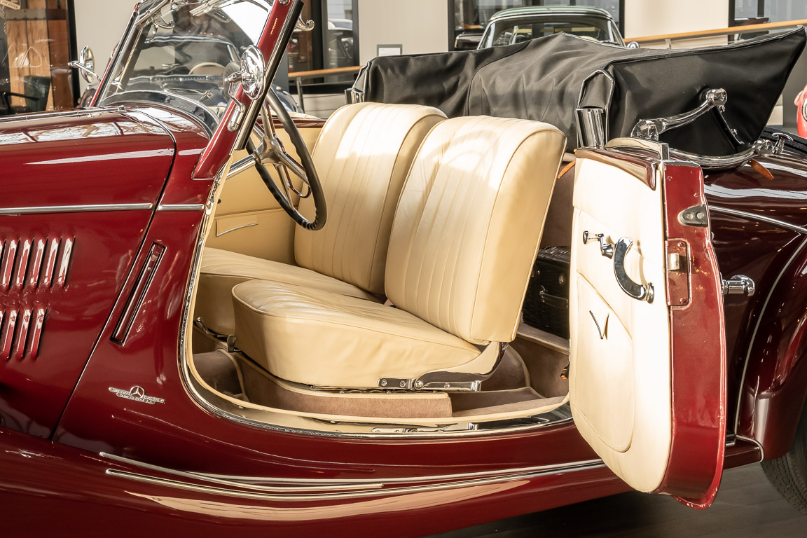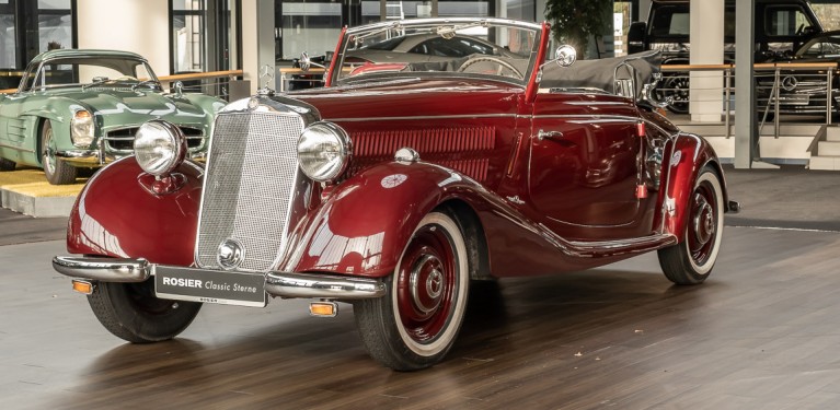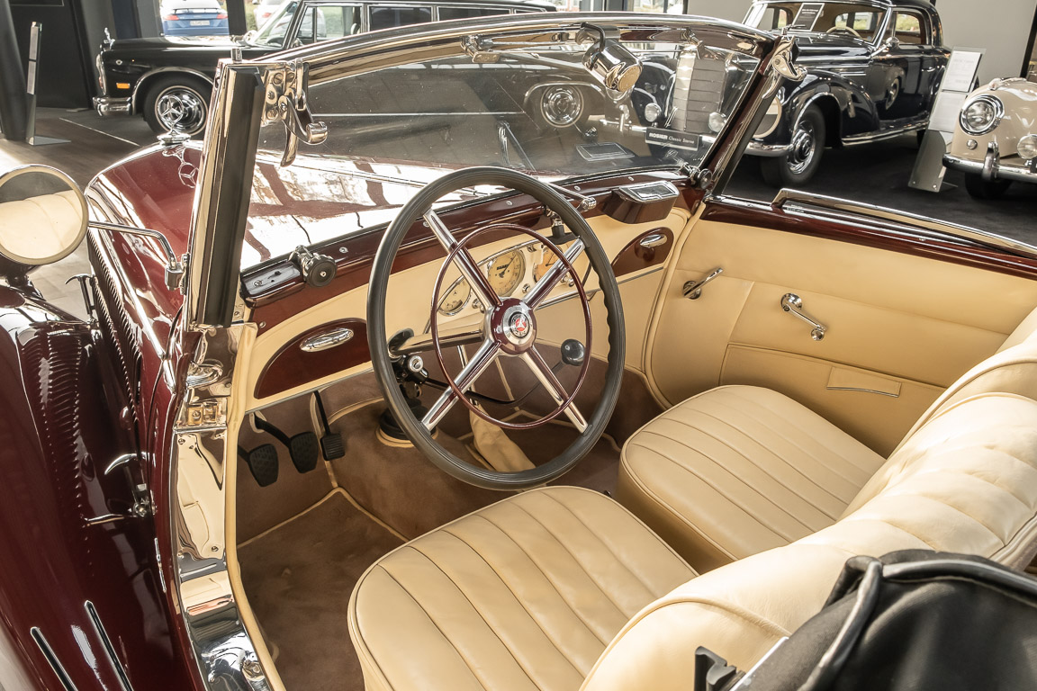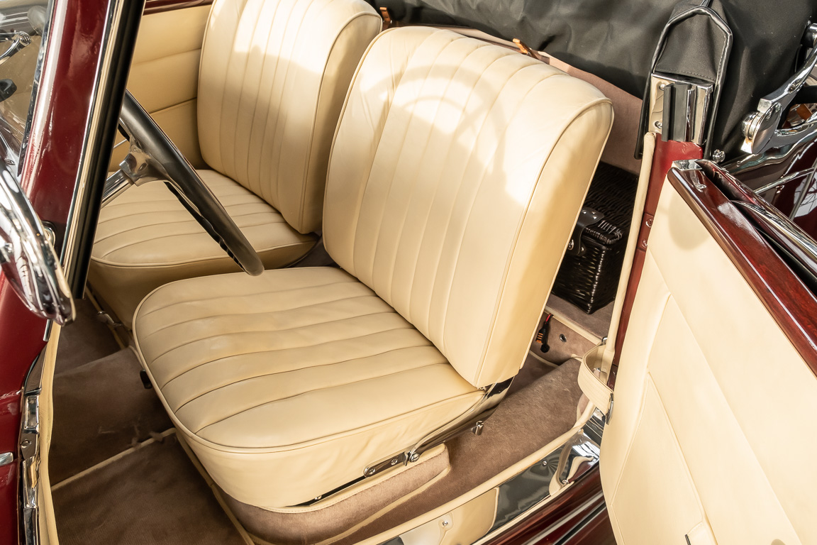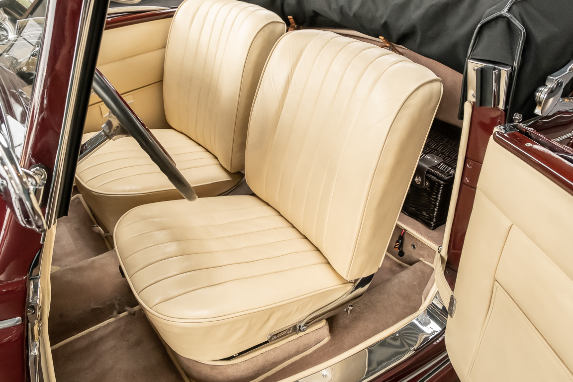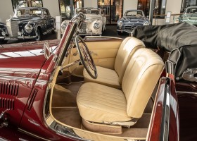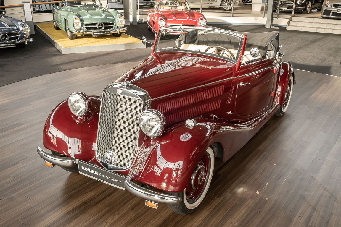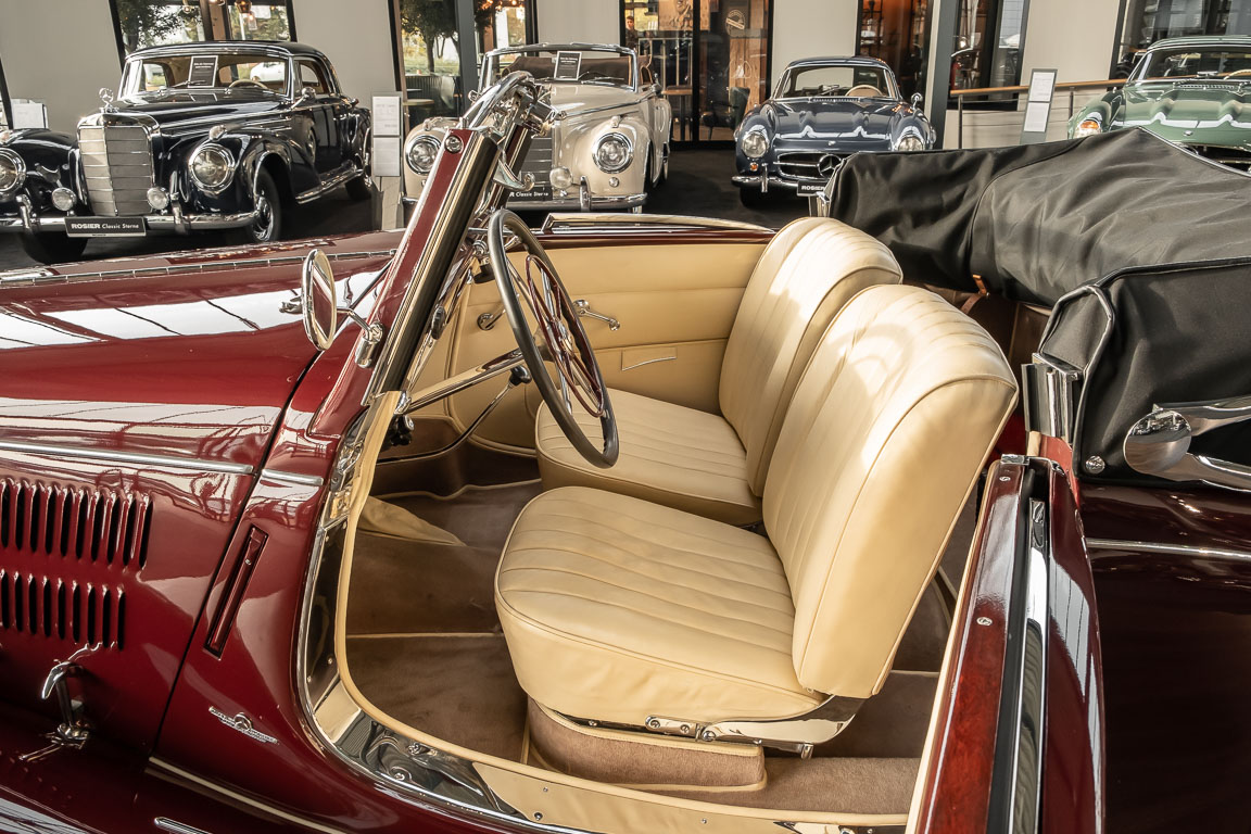 This Mercedes-Benz 170V Cabriolet A from 1938 is a convertible dream with a great history. The car was delivered to Jürgen Voigts in Voigtsgrund in the Gibeon district in October 1938 via the Metje + Ziegler dealership in Windhoek, Namibia, which still exists today. At that time, the farm of the respected German-born Voigts family already covered 160,000 hectares of mostly private land and was known for its herds of 17,000 Karakul sheep. The wagon remained in Namibia during the war years and only returned to Germany after the war. It found its home in the Munich area and in the mid-1960s belonged to the actor Danilo Zschauer from Munich, among others, as can be seen from the original cardboard letter. On August 25, 1978, the convertible came into the possession of a highly successful entrepreneur in the Märkischer Kreis district of North Rhine-Westphalia, according to the original purchase contract available to us. He took excellent care of the car and maintained it, but decided in the mid-1980s to carry out a complete restoration. The restoration was of such quality that even today, many years later, the car presents itself in almost immaculate condition. It invites you to take stylish trips through picturesque landscapes with endless convertible pleasure.