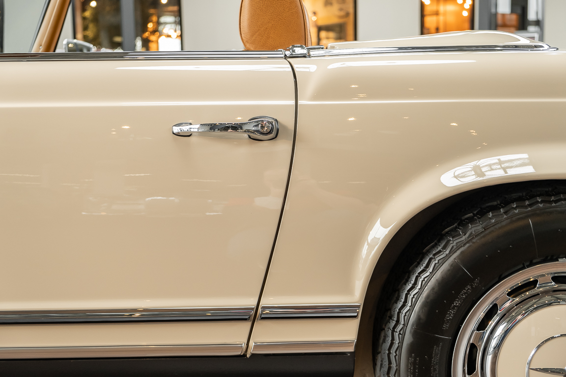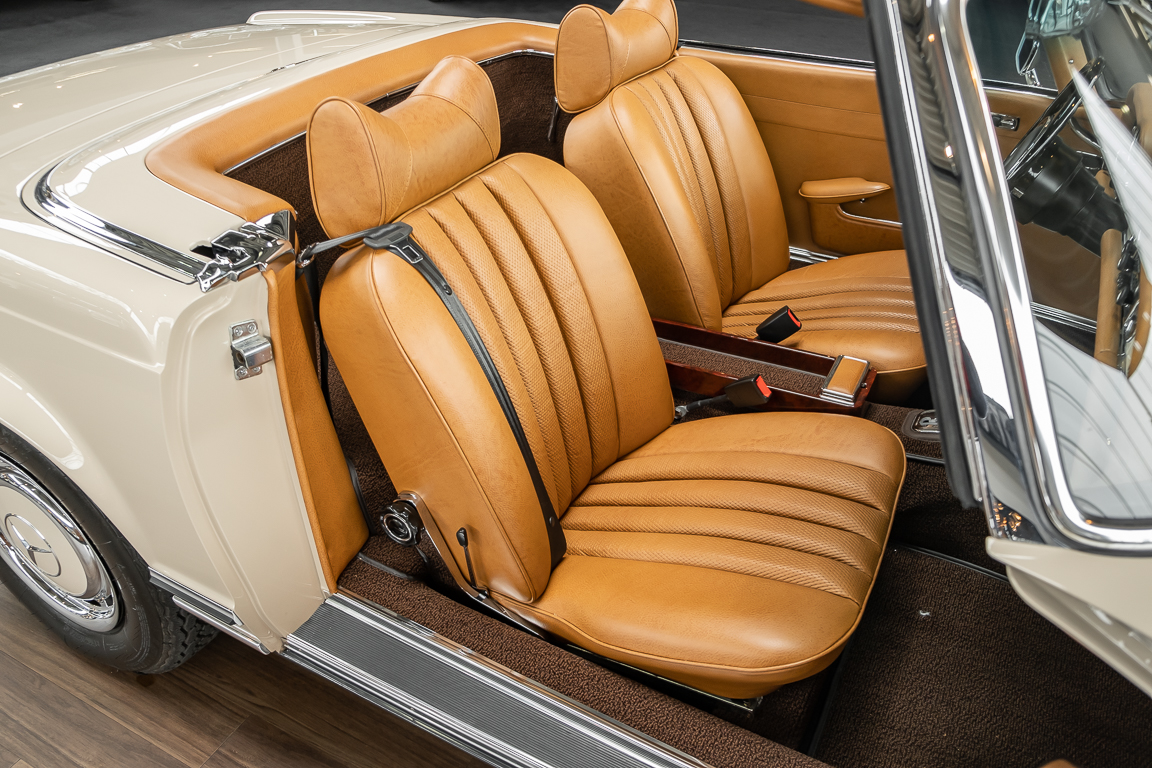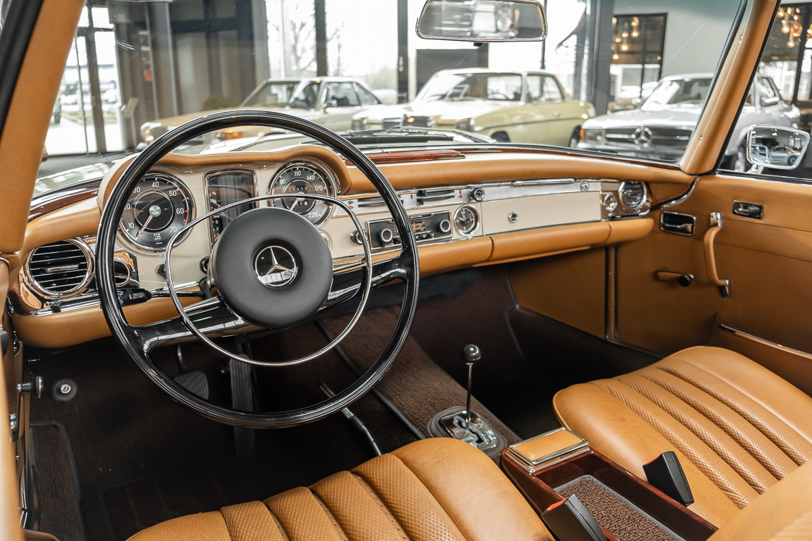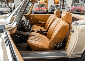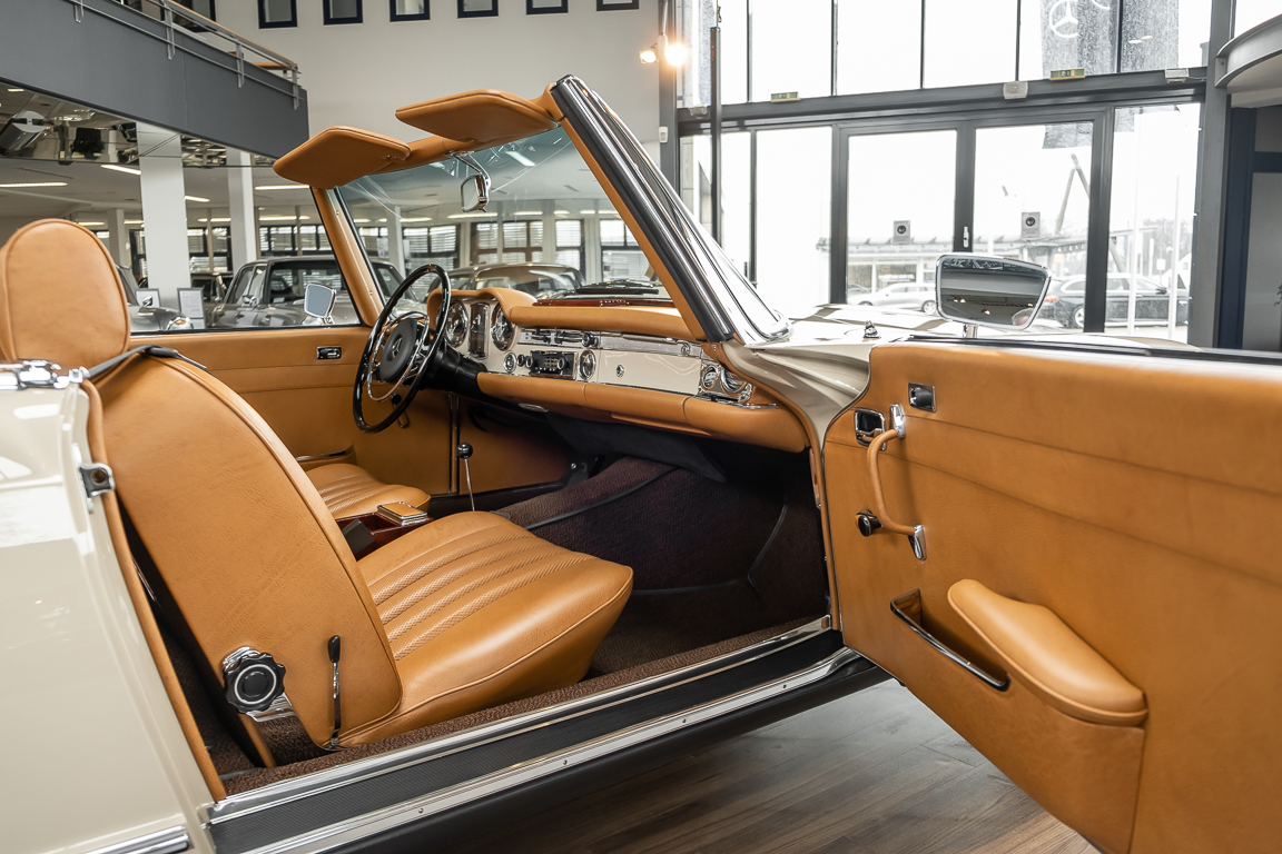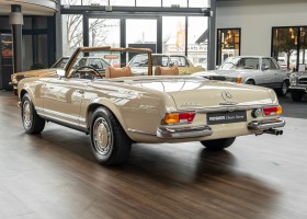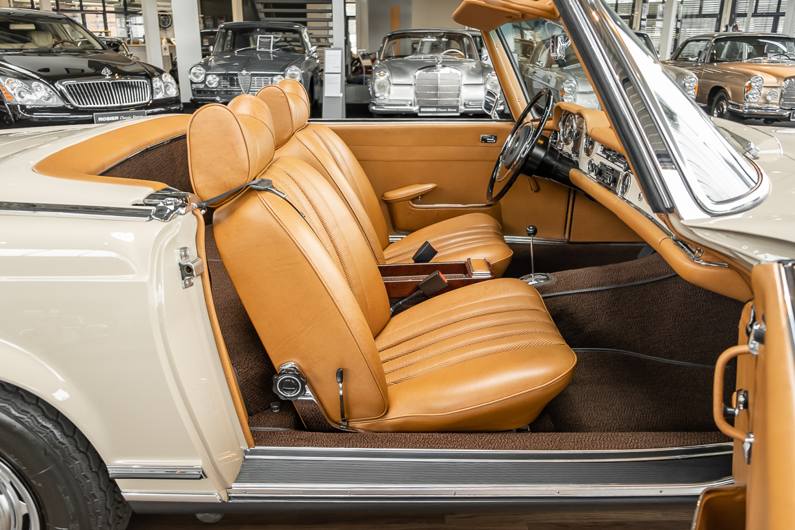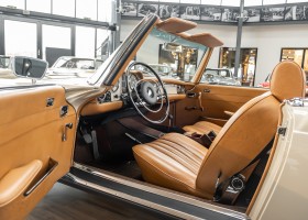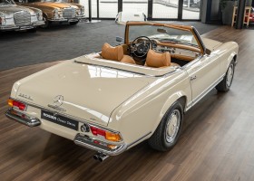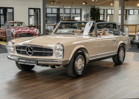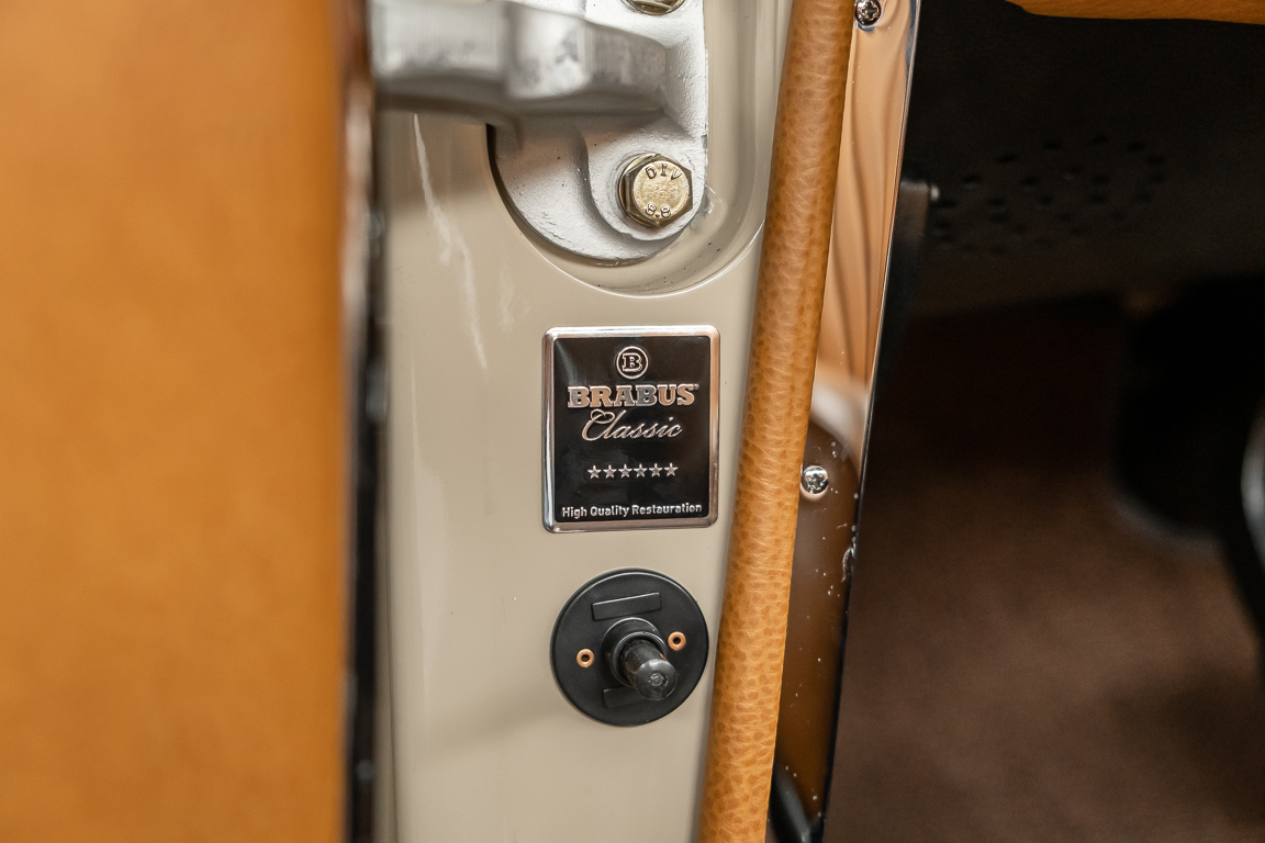 A Pagoda restored at the highest level in the house BRABUS. True to original according to data card, rebuilt with great attention to detail as a 6 star restoration. Countless new parts were used. For such a complex restoration, between 5 and 6,000 working hours are needed. In return, a quality of unique excellence is achieved in the end. All components were checked, machined or replaced and restored to top condition. The body was carefully stripped of paint using the most modern techniques and a new coat of paint was applied. The interior was carefully sewn and fitted in fine leather by experienced saddlers. A result that demands high recognition from even the most pampered professional. We would be happy to show you this dream pagoda in detail, take your time, it's worth it.