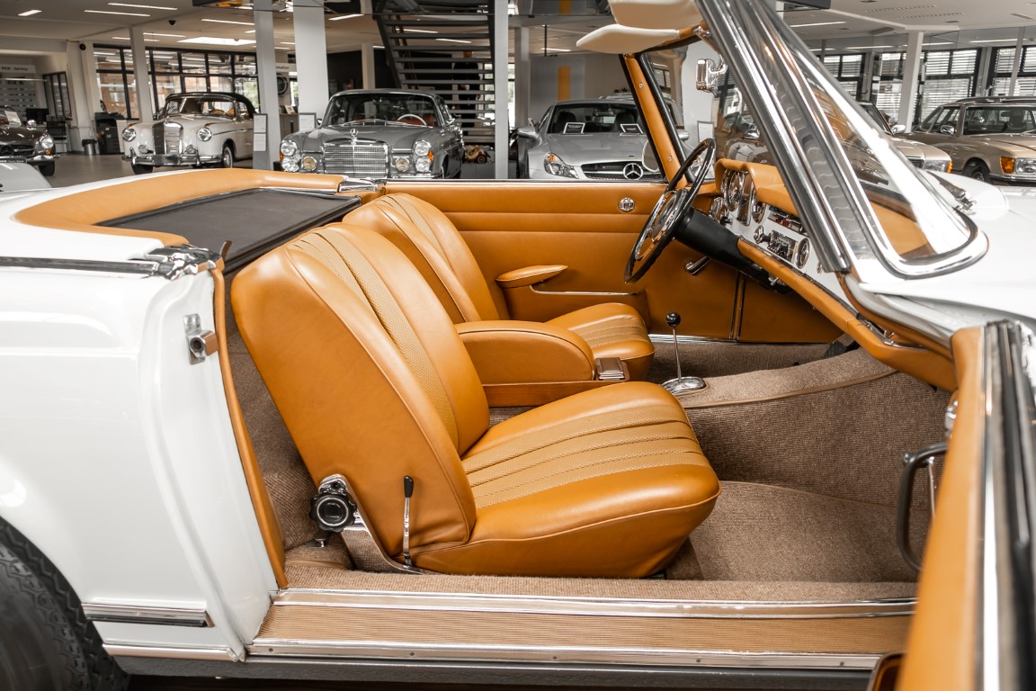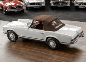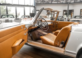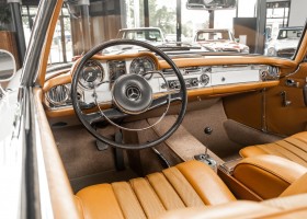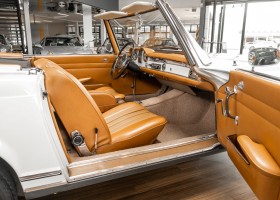 Eine wahrhaft einzigartige 230 SL Pagode können wir Ihnen mit diesem Traumroadster in klassischem Papyrusweiss mit braunem Kunstleder anbieten. Nicht mehr oft wird man eine solch originale und toperhaltene Pagode finden. Dem originalen Kundendienstheft ist zu entnehmen, dass das Fahrzeug am 17.11.1966 an seinen Besitzer in die französische Metropole Paris, genauer gesagt in die Gemeinde Ivry-sur-Seine – etwa 7km südöstlich des Pariser Stadtzentrums, geliefert wurde. Den lückenlosen Einträgen zufolge verblieb das Fahrzeug bis 1978 in Paris. Einträge aus Nizza und Monaco zeugen von ausgiebigen Reisen an die malerische Côte d’Azur, in dessen Umgebung sich dieser Klassiker wohl bestens eingefunden hat.
