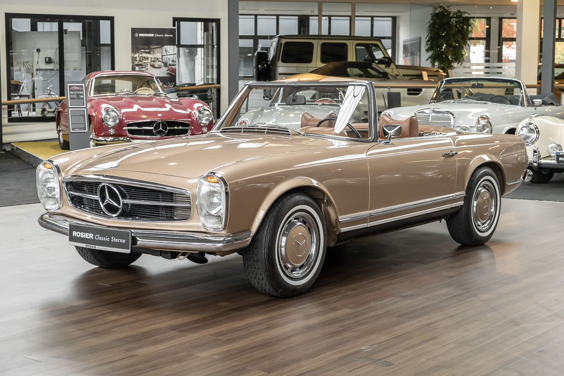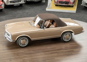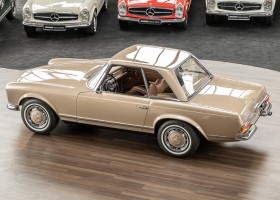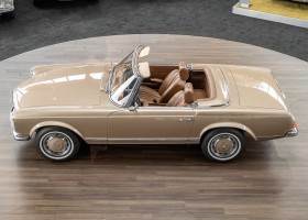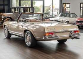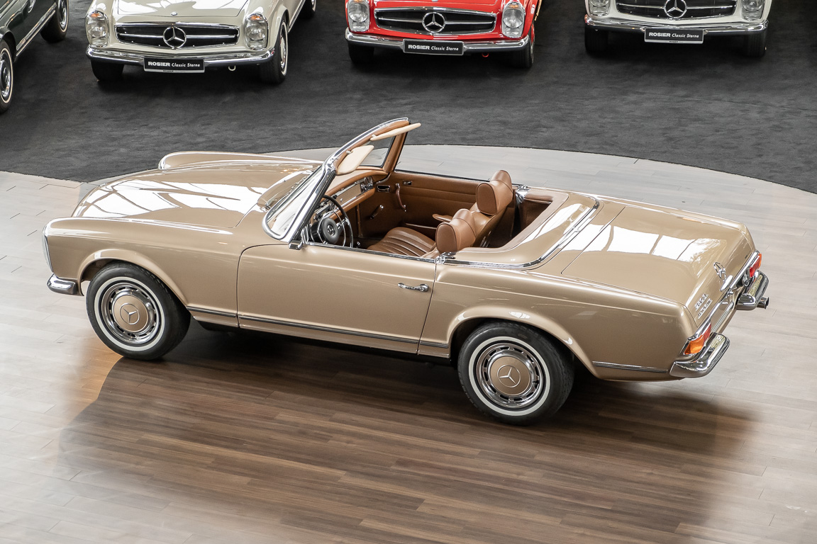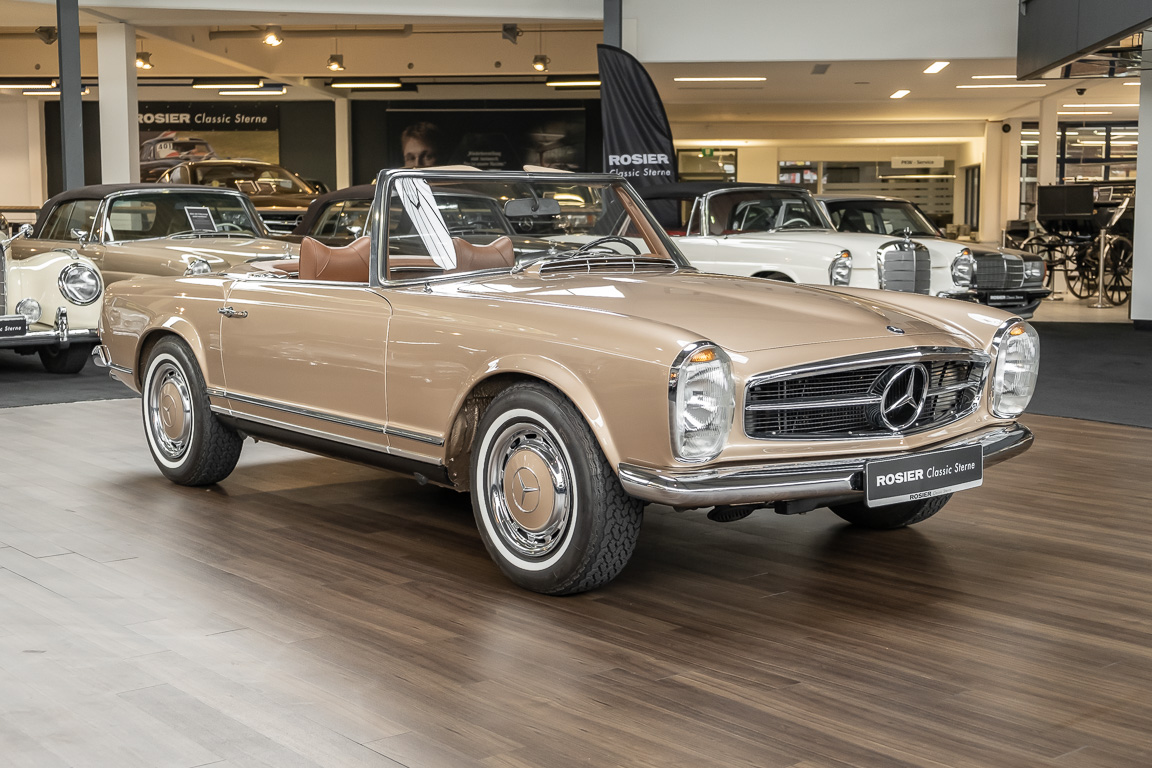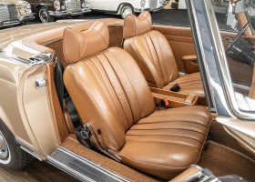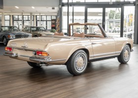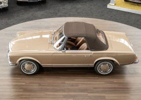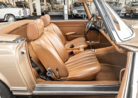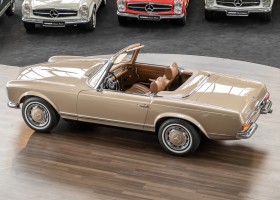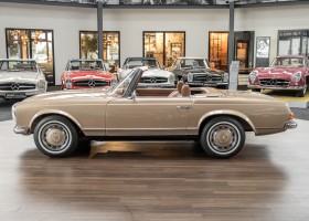 Die angebotene Mercedes-Benz 280SL Pagode wurde in 1969 im Mercedes Werk fertiggestellt und in die USA geliefert. Die elegante Farbgebung in Sandbeige-metallic in Verbindung mit cognacfarbener Innenausstattung unterstrich den eleganten Auftritt schon damals in ganz besonderem Maße. Im März 1972 wurde der Wagen von seinem Erstbesitzer nach London, Großbritannien, verkauft. Er kam in den Besitz einer Diplomatenfamilie die neben dem Primrose Hill unweit des herrlich schönen Regent’s Park, in eleganter Gegend Londons lebte. Vermutlich war es die Dame des Hauses, die den Wagen in London und im Schweizerischen Genf nutzte. Nach rund 30 Jahren im Besitz entschied sich die Familie, die Pagode zu verkaufen. So übernahm im Februar 2001 ein Schweizer Gastronom aus dem malerischen Fribourg in der Westschweiz die Pagode. Während seinem Besitz wurde im Juli 2001 bei einem autorisierten Mercedes-Benz Partner ein Werksaustauschmotor eingebaut. Die Rechnung über knapp CHF 30.000,- liegt im Original vor. In 2003 wurde der Wagen von einem deutschen Fabrikanten für seine Sammlung erworben. Er ließ die Pagode wo nötig fachmännisch überarbeiten und versetzte sie in den jetzigen Traumzustand. Nach mittlerweile fast 20 Jahren in Sammlerbesitz und -pflege soll der schicke Roadster ein neues Zuhause bekommen. Nutzen Sie die Chance auf ein solides Fahrzeug, mit toller nachvollziehbarer Historie. Wir beraten Sie gerne.