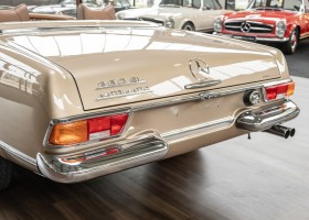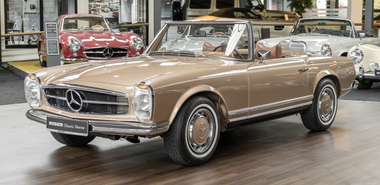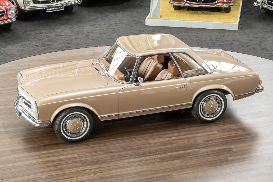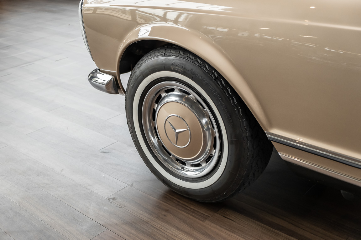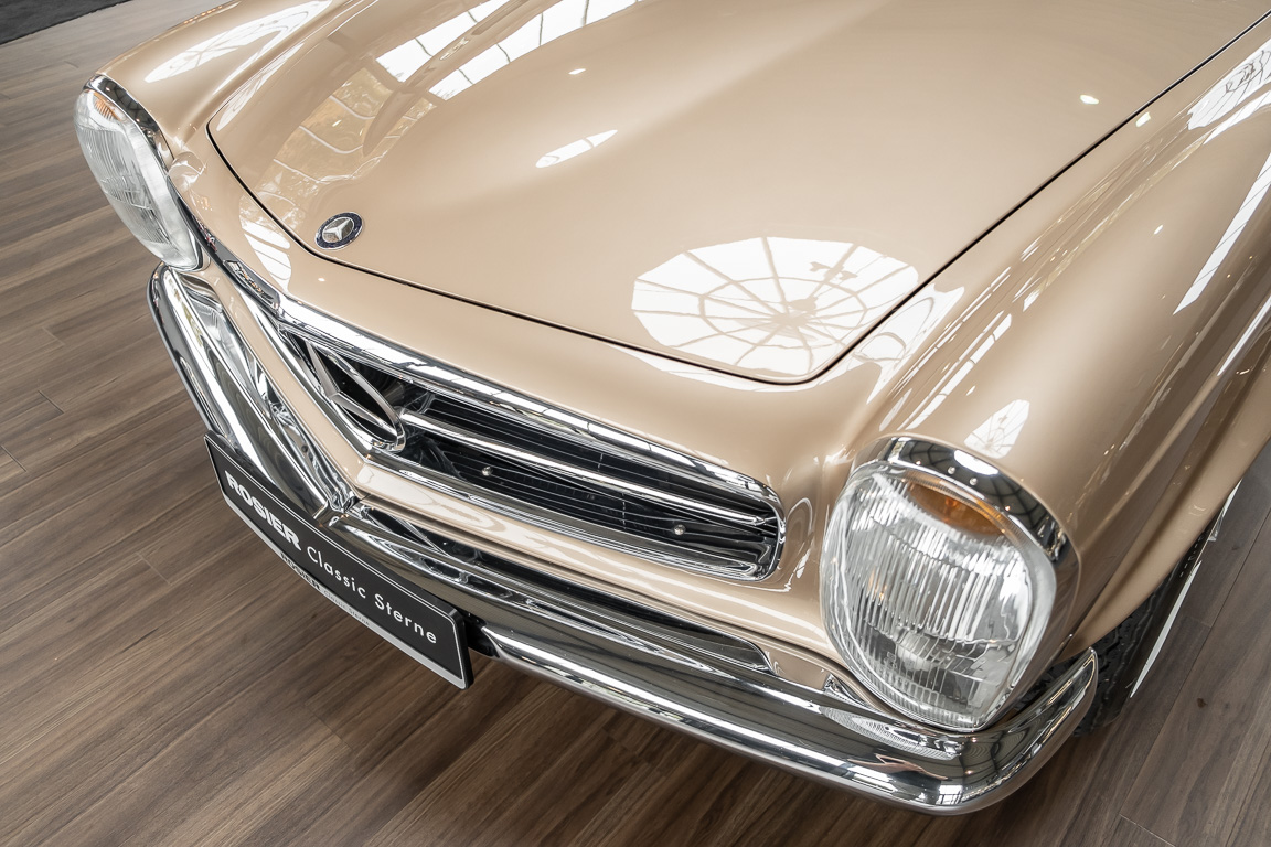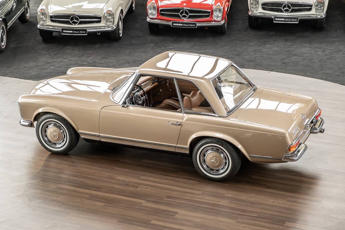 Die angebotene Mercedes-Benz 280SL Pagode wurde in 1969 im Mercedes Werk fertiggestellt und in die USA geliefert. Die elegante Farbgebung in Sandbeige-metallic in Verbindung mit cognacfarbener Innenausstattung unterstrich den eleganten Auftritt schon damals in ganz besonderem Maße. Im März 1972 wurde der Wagen von seinem Erstbesitzer nach London, Großbritannien, verkauft. Er kam in den Besitz einer Diplomatenfamilie die neben dem Primrose Hill unweit des herrlich schönen Regent’s Park, in eleganter Gegend Londons lebte. Vermutlich war es die Dame des Hauses, die den Wagen in London und im Schweizerischen Genf nutzte. Nach rund 30 Jahren im Besitz entschied sich die Familie, die Pagode zu verkaufen. So übernahm im Februar 2001 ein Schweizer Gastronom aus dem malerischen Fribourg in der Westschweiz die Pagode. Während seinem Besitz wurde im Juli 2001 bei einem autorisierten Mercedes-Benz Partner ein Werksaustauschmotor eingebaut. Die Rechnung über knapp CHF 30.000,- liegt im Original vor. In 2003 wurde der Wagen von einem deutschen Fabrikanten für seine Sammlung erworben. Er ließ die Pagode wo nötig fachmännisch überarbeiten und versetzte sie in den jetzigen Traumzustand. Nach mittlerweile fast 20 Jahren in Sammlerbesitz und -pflege soll der schicke Roadster ein neues Zuhause bekommen. Nutzen Sie die Chance auf ein solides Fahrzeug, mit toller nachvollziehbarer Historie. Wir beraten Sie gerne.