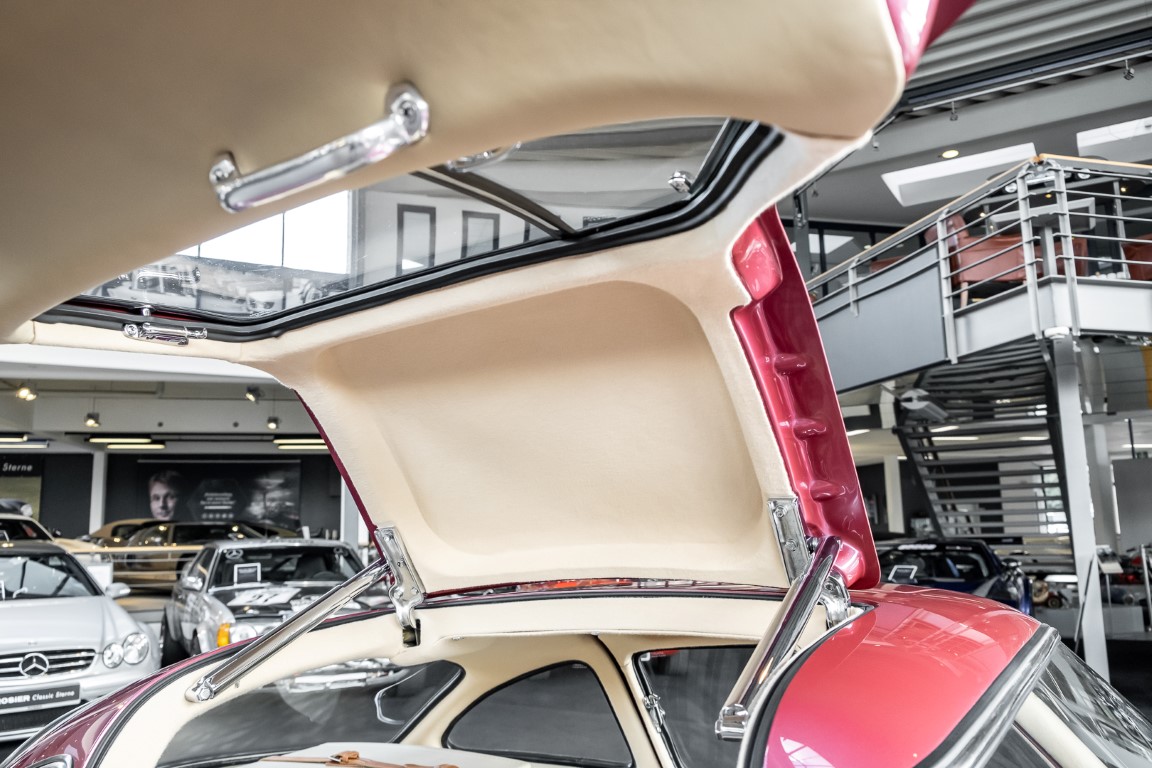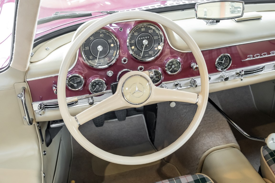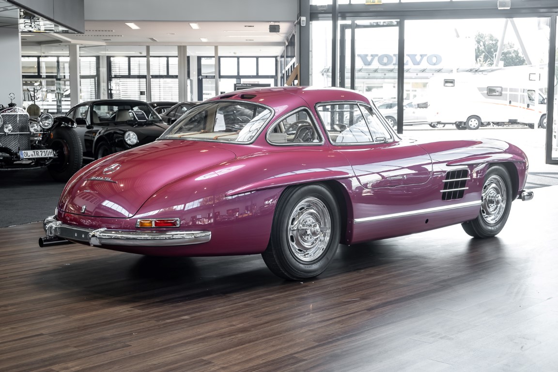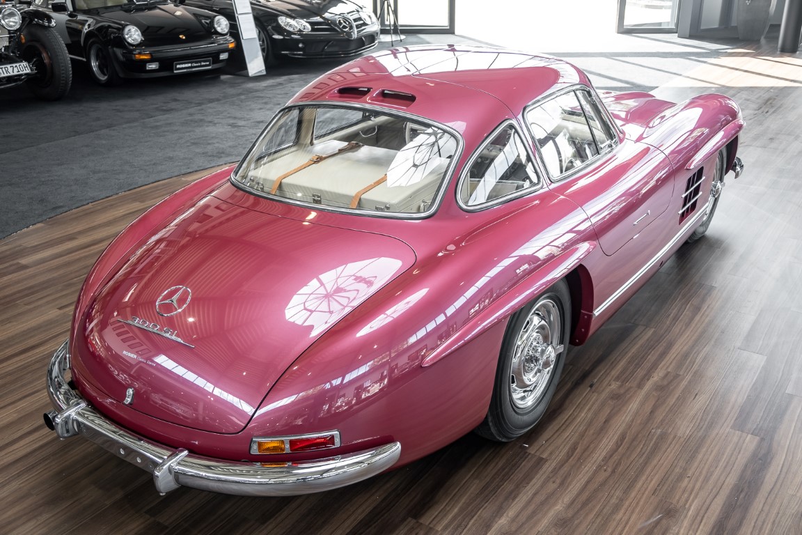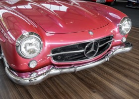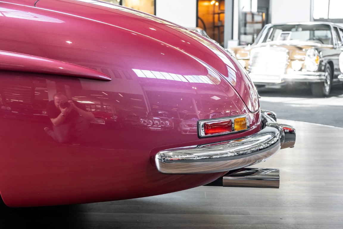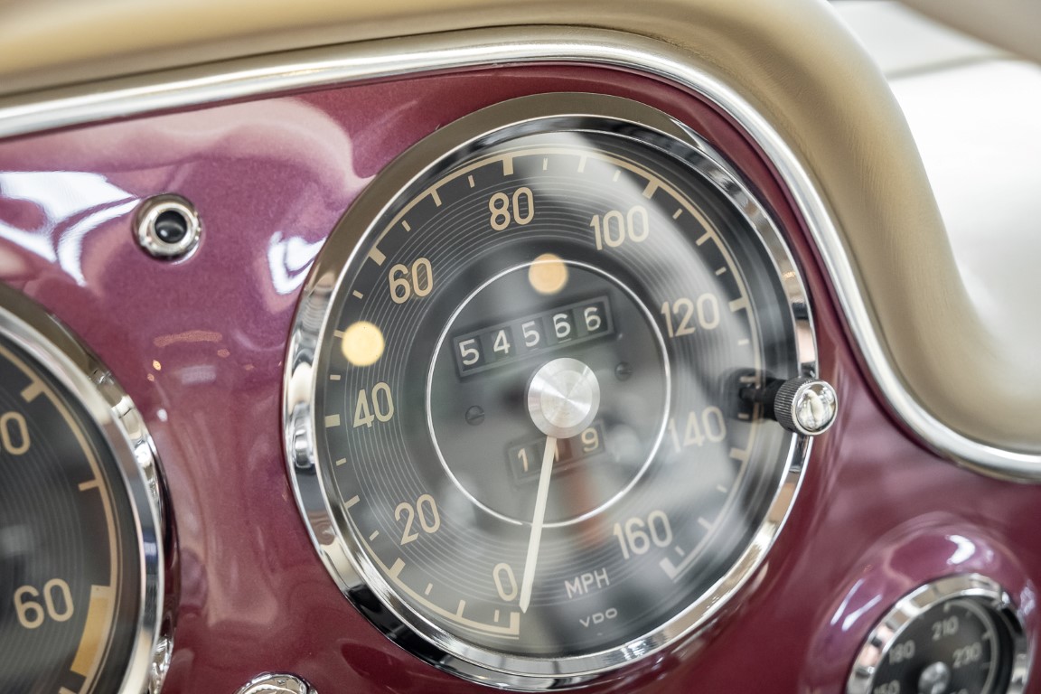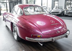 Laut dem Gullwing Group Registry war der erste Besitzer des Coupés Nr. 20 Roy Miller aus China Lake, USA. In den frühen 1970er Jahren wurde Weston Hook aus La Jolla, Kalifornien, Eigentümer, der den Wagen in den nächsten vier Jahrzehnten betreute und schließlich an seinen Sohn übergab. Weston Hook verbrachte seine Zeit sowohl in Kalifornien als auch auf Hawaii, wobei letzteres das Zentrum seiner Immobiliengeschäfte war, und so pendelte der Wagen zwischen den beiden sonnigen Orten am Pazifik. Nach mehreren Jahrzehnten des Besitzes und der Nutzung beauftragte Hook den wohl renommiertesten 300 SL-Restaurator Jerry Hjeltness aus Escondido, Kalifornien, mit einer Restaurierung, deren Ergebnis man kurz und knapp als außergewöhnlich bezeichnen kann. Im Laufe von zwei Jahren und mit viel Liebe zum Detail wurde der Flügel mit der Nr. 20 bis ins kleinste Detail komplett restauriert und in den zeitgemäßen Mercedes- Farben DB 543 Erdbeerrot Metallic lackiert. Die Kombination mit beigefarbener Lederausstattung und grün karierten Sitzen ist stilsicher und außergewöhnlich. Passendes Gepäck und verchromte Rudge-Räder vervollständigen das unbestreitbar schöne Erscheinungsbild, das in jeder Gesellschaft die Aufmerksamkeit auf sich zieht. Das Ergebnis dieser Restaurierung hat unweigerlich zu vielen Concours-Siegen in der Klasse und in ganzen Ausstellungsbereichen geführt. Das Auto ist einfach eine „Best-of-the-Best“-Restaurierung, von einem der besten 300SL-Restauratoren.