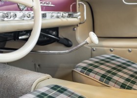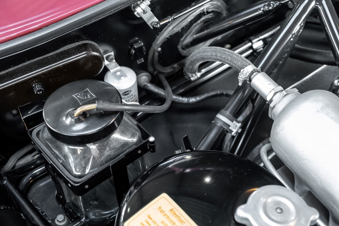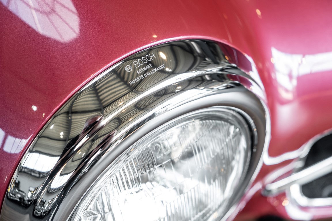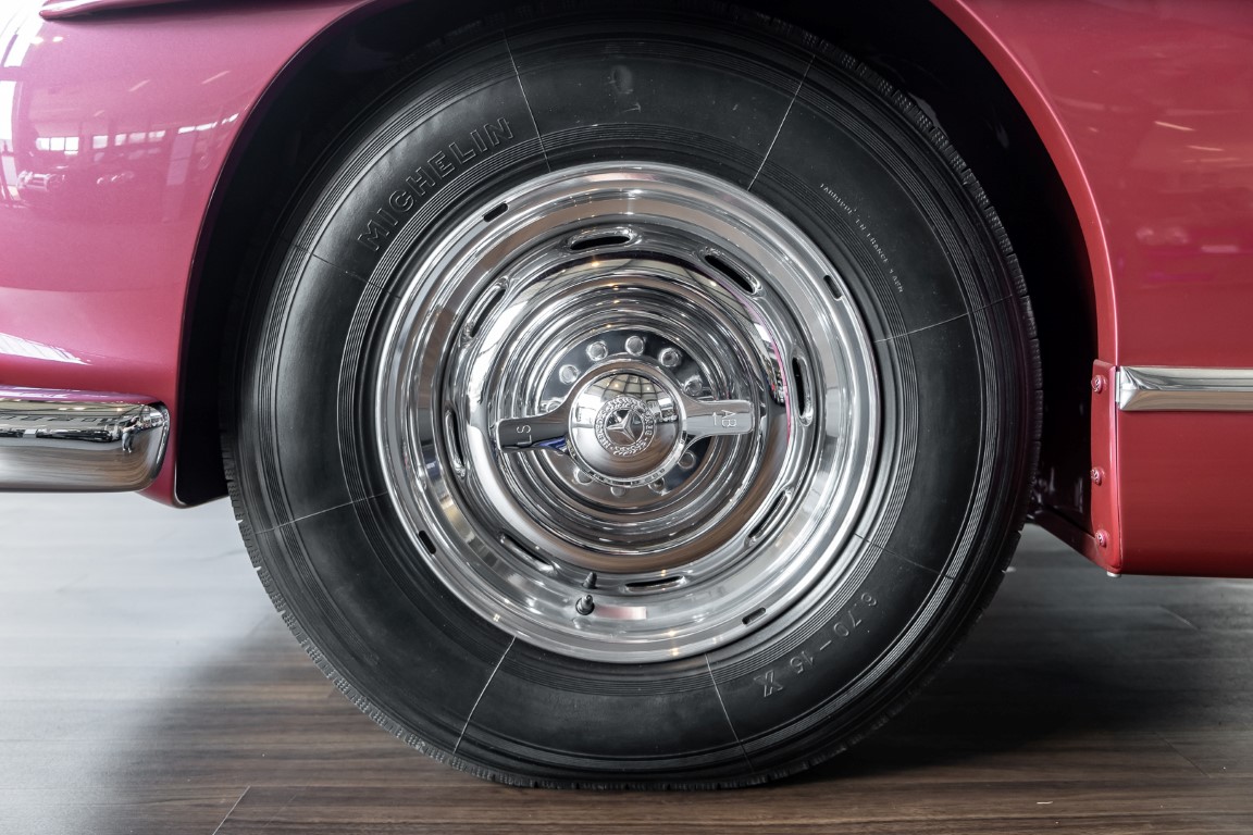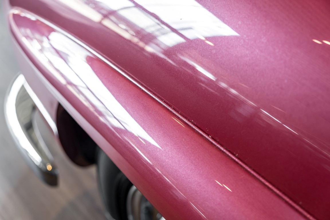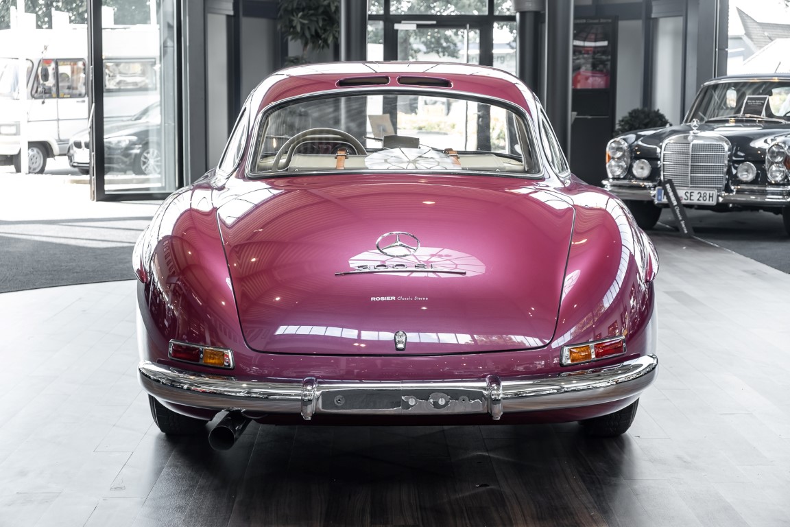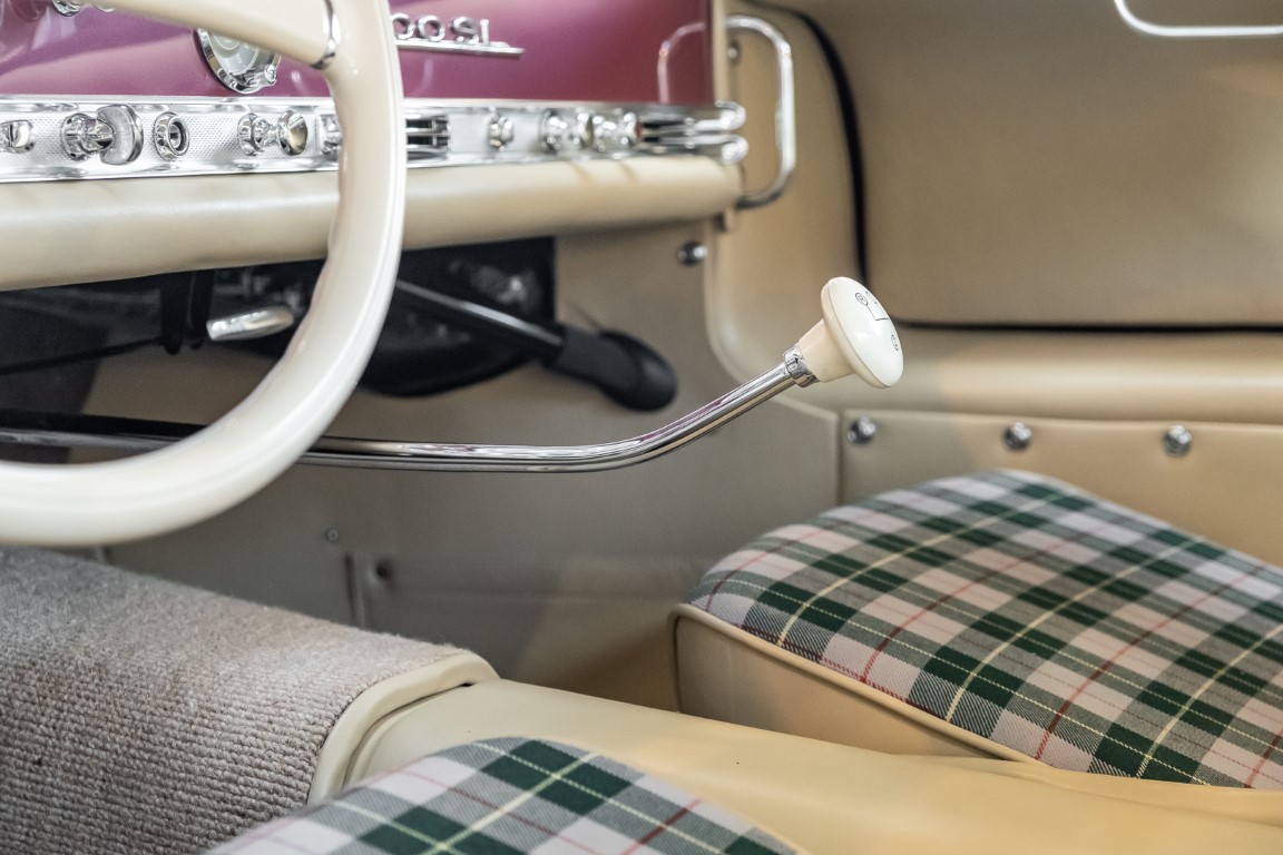 Laut dem Gullwing Group Registry war der erste Besitzer des Coupés Nr. 20 Roy Miller aus China Lake, USA. In den frühen 1970er Jahren wurde Weston Hook aus La Jolla, Kalifornien, Eigentümer, der den Wagen in den nächsten vier Jahrzehnten betreute und schließlich an seinen Sohn übergab. Weston Hook verbrachte seine Zeit sowohl in Kalifornien als auch auf Hawaii, wobei letzteres das Zentrum seiner Immobiliengeschäfte war, und so pendelte der Wagen zwischen den beiden sonnigen Orten am Pazifik. Nach mehreren Jahrzehnten des Besitzes und der Nutzung beauftragte Hook den wohl renommiertesten 300 SL-Restaurator Jerry Hjeltness aus Escondido, Kalifornien, mit einer Restaurierung, deren Ergebnis man kurz und knapp als außergewöhnlich bezeichnen kann. Im Laufe von zwei Jahren und mit viel Liebe zum Detail wurde der Flügel mit der Nr. 20 bis ins kleinste Detail komplett restauriert und in den zeitgemäßen Mercedes- Farben DB 543 Erdbeerrot Metallic lackiert. Die Kombination mit beigefarbener Lederausstattung und grün karierten Sitzen ist stilsicher und außergewöhnlich. Passendes Gepäck und verchromte Rudge-Räder vervollständigen das unbestreitbar schöne Erscheinungsbild, das in jeder Gesellschaft die Aufmerksamkeit auf sich zieht. Das Ergebnis dieser Restaurierung hat unweigerlich zu vielen Concours-Siegen in der Klasse und in ganzen Ausstellungsbereichen geführt. Das Auto ist einfach eine „Best-of-the-Best“-Restaurierung, von einem der besten 300SL-Restauratoren.