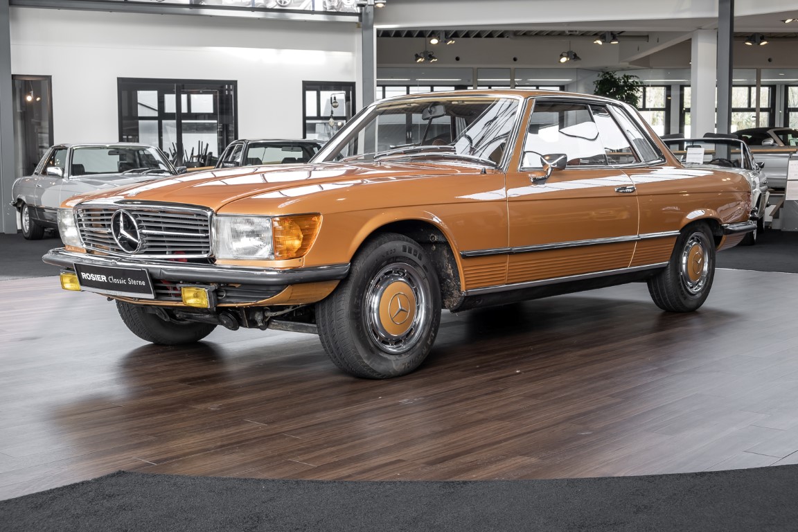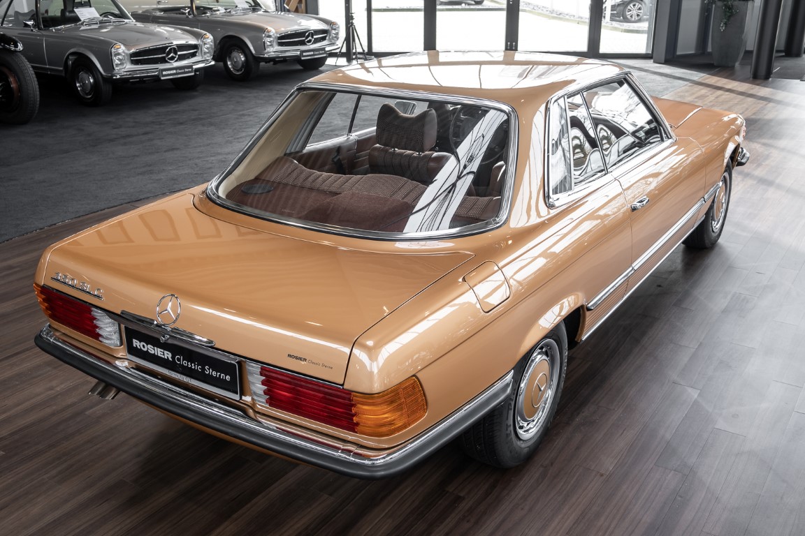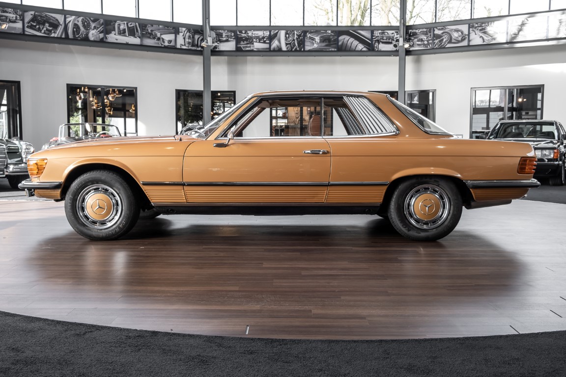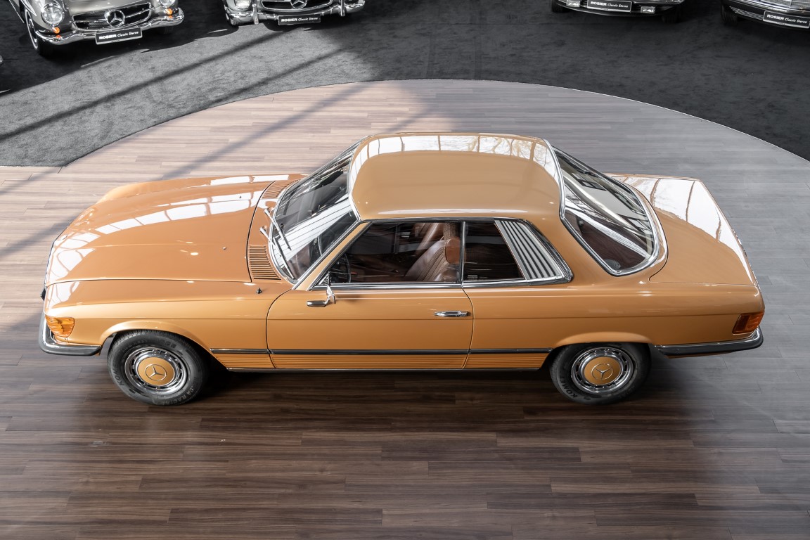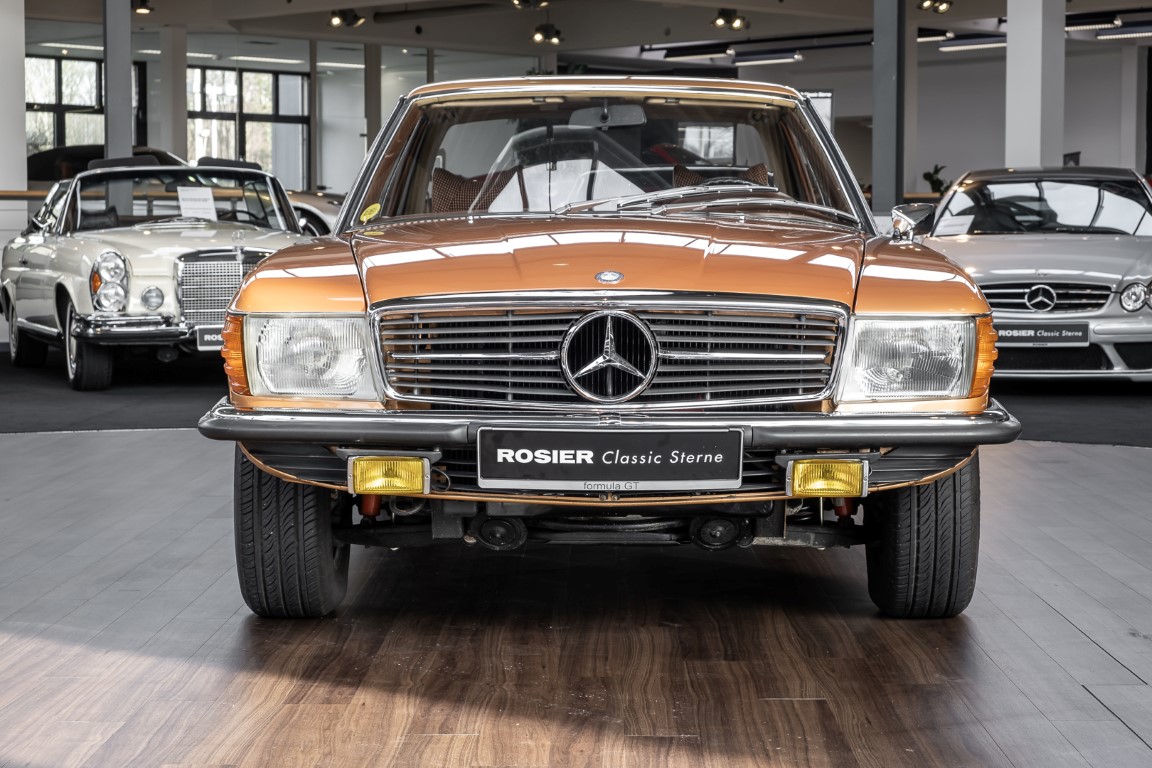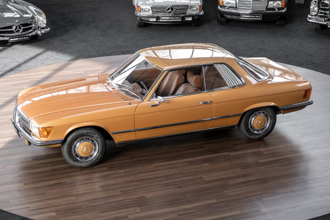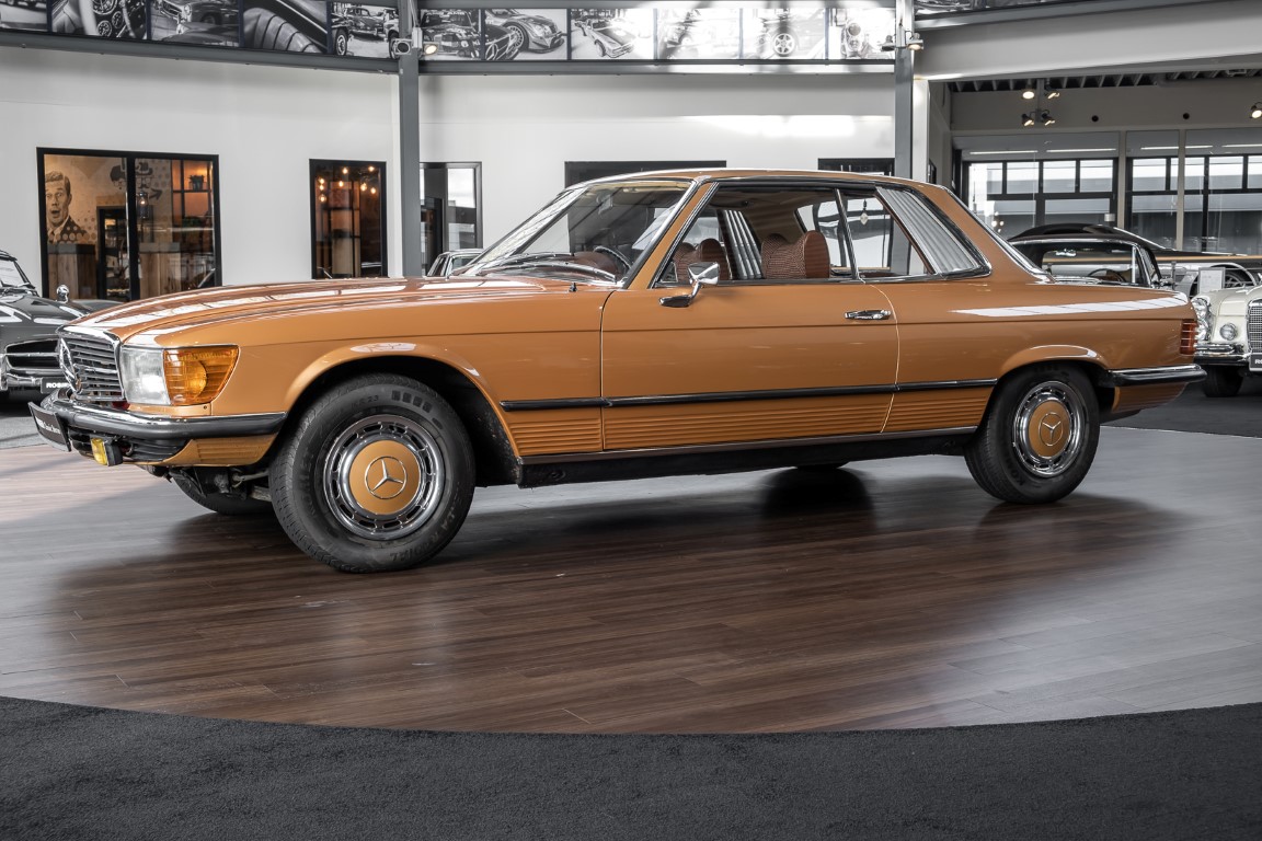 Wir freuen uns Ihnen hier ein ganz besonderes Fahrzeug aus der 107er Reihe präsentieren zu können, ein Mercedes-Benz 350 SLC Coupé aus 1973. Die Farbe „Byzanzgold Metallic“ in Verbindung mit der brauen Stoff/Lederkombination mit Karomuster, spiegelt deutlich den Zeitgeist der 1970er Jahre wieder. Das hier in vollendeter Eleganz präsentierte Coupé wurde 1973 an einen sehr vermögenden Erstbesitzer in Frankreich ausgeliefert. Bei Ihm verblieb der Wagen vermutlich bis 1985. Danach wurde er auf seinen nächsten Besitzer, ebenfalls in Frankreich zugelassen, wie die „Carte Grise“ umgangssprachlich für das französische „Certificat d´Immatriculation“ belegt. Der neue Besitzer behielt das Fahrzeug etwa 27 Jahre in seinem Besitz, bevor er ihn an eine Dame aus Deutschland verkaufte, die das elegante Coupé an den derzeitigen Besitzer, einen erfolgreichen Geschäftsmann aus München verkaufte. Über all die Jahre und Fahrzeugbesitzer hinweg wurde das Fahrzeug nur höchstselten, zuletzt wohl nur noch zu Erhaltungsfahrten bewegt, was die Tacholaufleistung von sagenhaften 50.500 km glaubhaft belegt. Steigen Sie ein und erfahren Sie dieses ganz besondere Luxus-Coupé.
