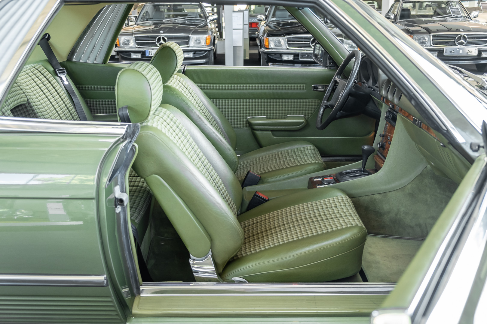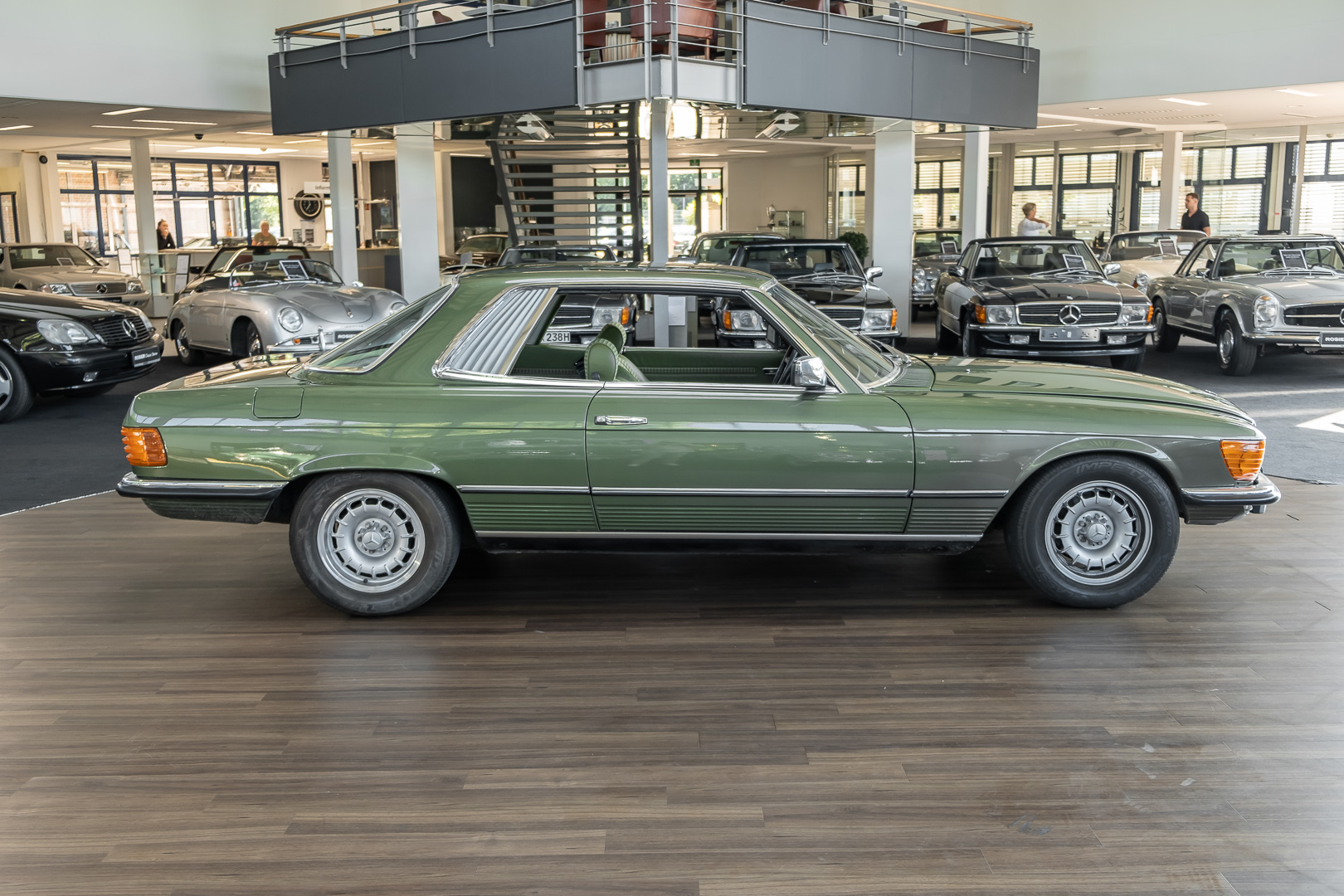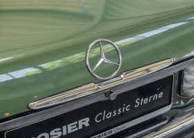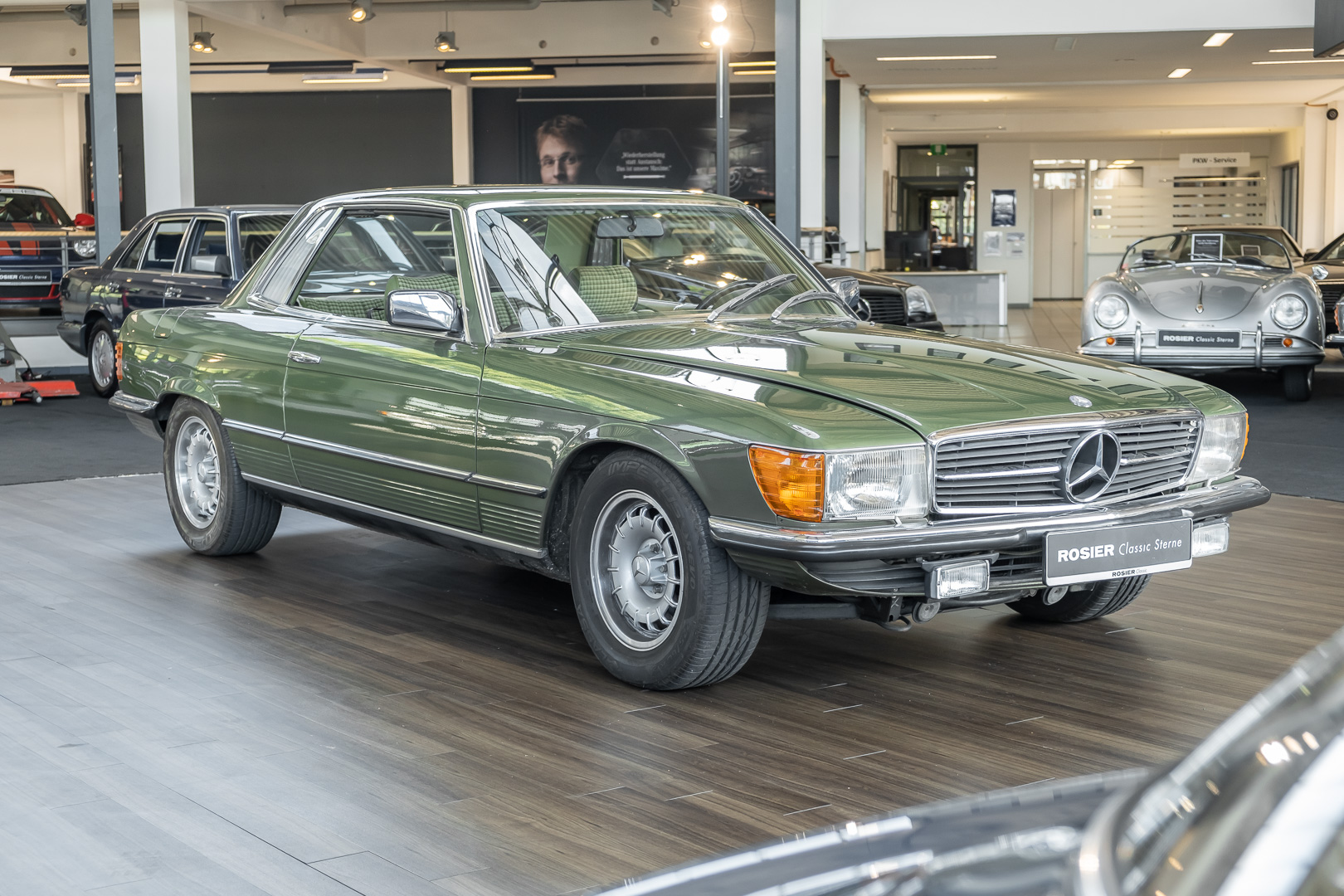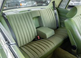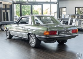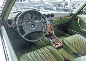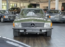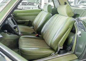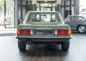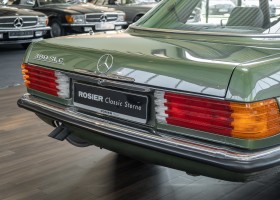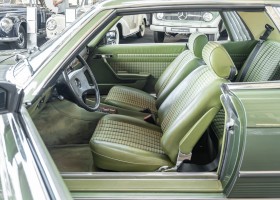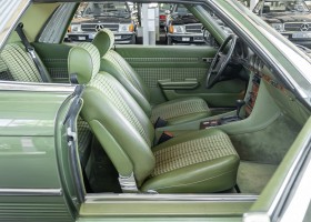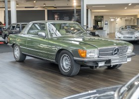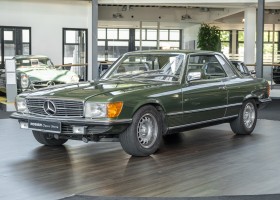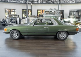 Ein automobiler Traum in Zypressengrün-metallic und der heute so gesuchten Stoff Karo Innenausstattung, passend in Olive, ist dieser Mercedes-Benz 380SLC aus der C107 Serie. Der Inhaber einer Rohrbiegerei im Schweizer Waengi, hatte sich in der Kreuzgarage Meggli in Elgg, seinen persönlichen Wunschtraum verwirklicht. Ein Mercedes-Benz Coupé mit kräftigem 8 Zylinder Motor, in seiner Lieblingsfarbe. Der Wagen bereitete ihm großen Fahrspaß. Er ließ jeden Kundendienst ausführen und jede Kleinigkeit sofort in Ordnung bringen. Es ist eine Freude das sorgfältig ausgefüllte Original Kundendienstscheckheft mit allen seinen Stempeln und Eintragungen zu lesen. Der Wagen blieb etwa 12 Jahre in der Schweiz. Im Mai 2013 kam das Coupé in eine zarte Damenhand im benachbarten Baden-Württemberg in Deutschland. Sein Weg führte es weiter über einen Besitzer in Schleswig-Holstein nach Braunschweig in Niedersachsen. Im Jahre 2017 konnten wir das Fahrzeug in eine Berliner Autosammlung verkaufen, aus dessen Besitz wir das Fahrzeug nun wieder anbieten düren. Der Pflegezustand des Wagens ist noch immer einmalig. Man sieht förmlich, dass er stets pfleglich behandelt und gewartet wurde. Die hohe Qualität der Lackierung zeigt, dass in jüngerer Zeit einmal eine fachmännische Überarbeitung stattfand. Die satte Farbe und der Tiefenglanz lassen das Coupé funkeln. Die Innenausstattung und die Technik zeigen sich von ihrer besten Seite. Eine Rarität, wie sie kaum zu finden ist. Es wurden nur 3.789 Fahrzeuge des 380 SLC gebaut, was ihn auch zu einem interessanten Sammlerobjekt macht.