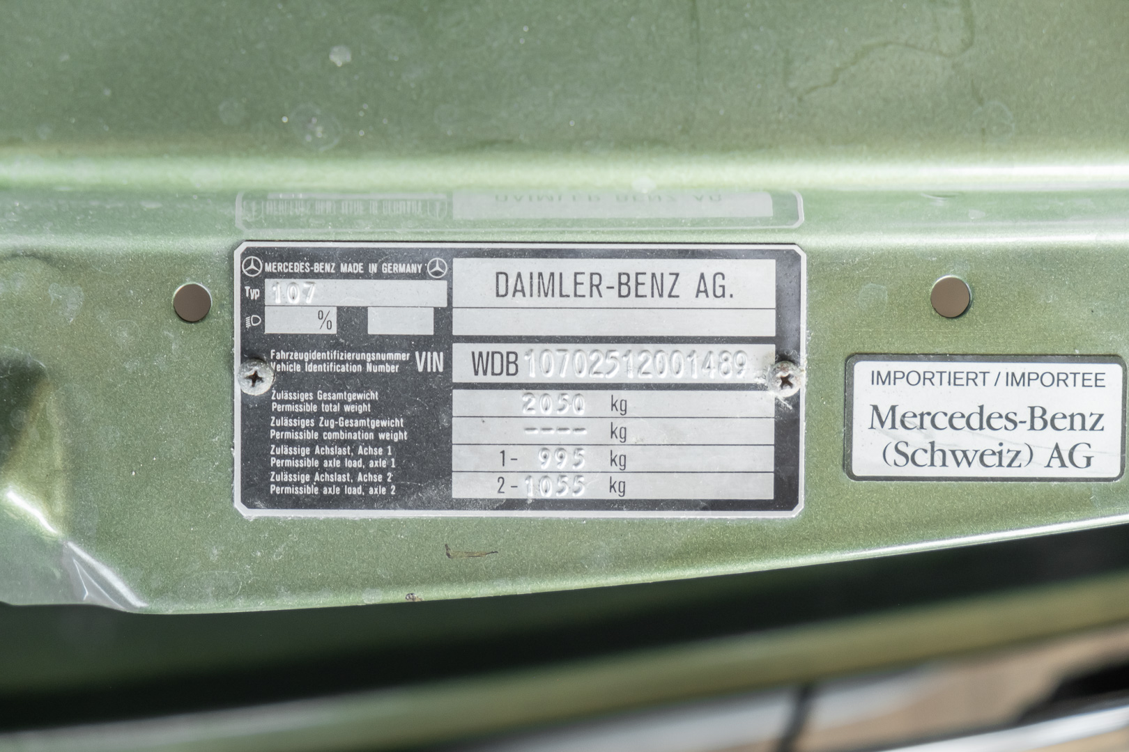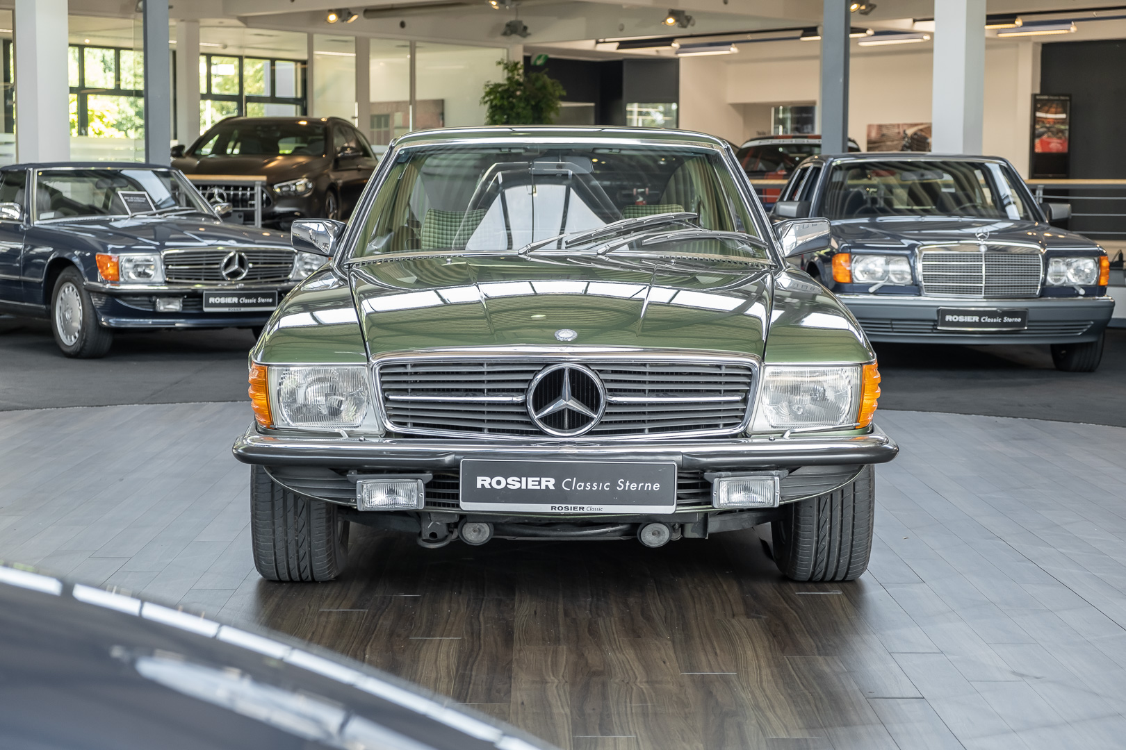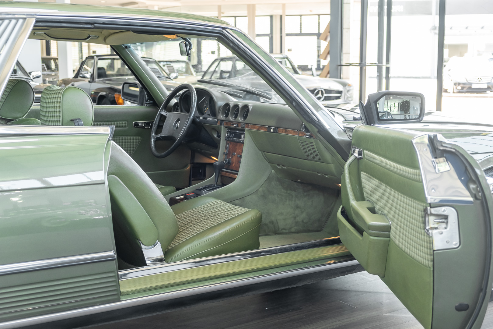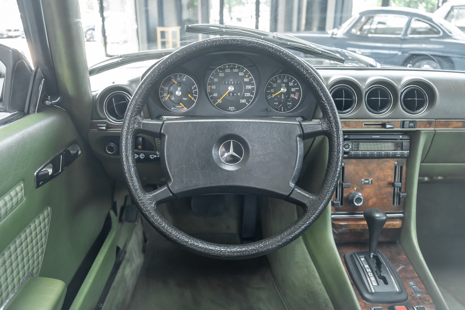 Ein automobiler Traum in Zypressengrün-metallic und der heute so gesuchten Stoff Karo Innenausstattung, passend in Olive, ist dieser Mercedes-Benz 380SLC aus der C107 Serie. Der Inhaber einer Rohrbiegerei im Schweizer Waengi, hatte sich in der Kreuzgarage Meggli in Elgg, seinen persönlichen Wunschtraum verwirklicht. Ein Mercedes-Benz Coupé mit kräftigem 8 Zylinder Motor, in seiner Lieblingsfarbe. Der Wagen bereitete ihm großen Fahrspaß. Er ließ jeden Kundendienst ausführen und jede Kleinigkeit sofort in Ordnung bringen. Es ist eine Freude das sorgfältig ausgefüllte Original Kundendienstscheckheft mit allen seinen Stempeln und Eintragungen zu lesen. Der Wagen blieb etwa 12 Jahre in der Schweiz. Im Mai 2013 kam das Coupé in eine zarte Damenhand im benachbarten Baden-Württemberg in Deutschland. Sein Weg führte es weiter über einen Besitzer in Schleswig-Holstein nach Braunschweig in Niedersachsen. Im Jahre 2017 konnten wir das Fahrzeug in eine Berliner Autosammlung verkaufen, aus dessen Besitz wir das Fahrzeug nun wieder anbieten düren. Der Pflegezustand des Wagens ist noch immer einmalig. Man sieht förmlich, dass er stets pfleglich behandelt und gewartet wurde. Die hohe Qualität der Lackierung zeigt, dass in jüngerer Zeit einmal eine fachmännische Überarbeitung stattfand. Die satte Farbe und der Tiefenglanz lassen das Coupé funkeln. Die Innenausstattung und die Technik zeigen sich von ihrer besten Seite. Eine Rarität, wie sie kaum zu finden ist. Es wurden nur 3.789 Fahrzeuge des 380 SLC gebaut, was ihn auch zu einem interessanten Sammlerobjekt macht.