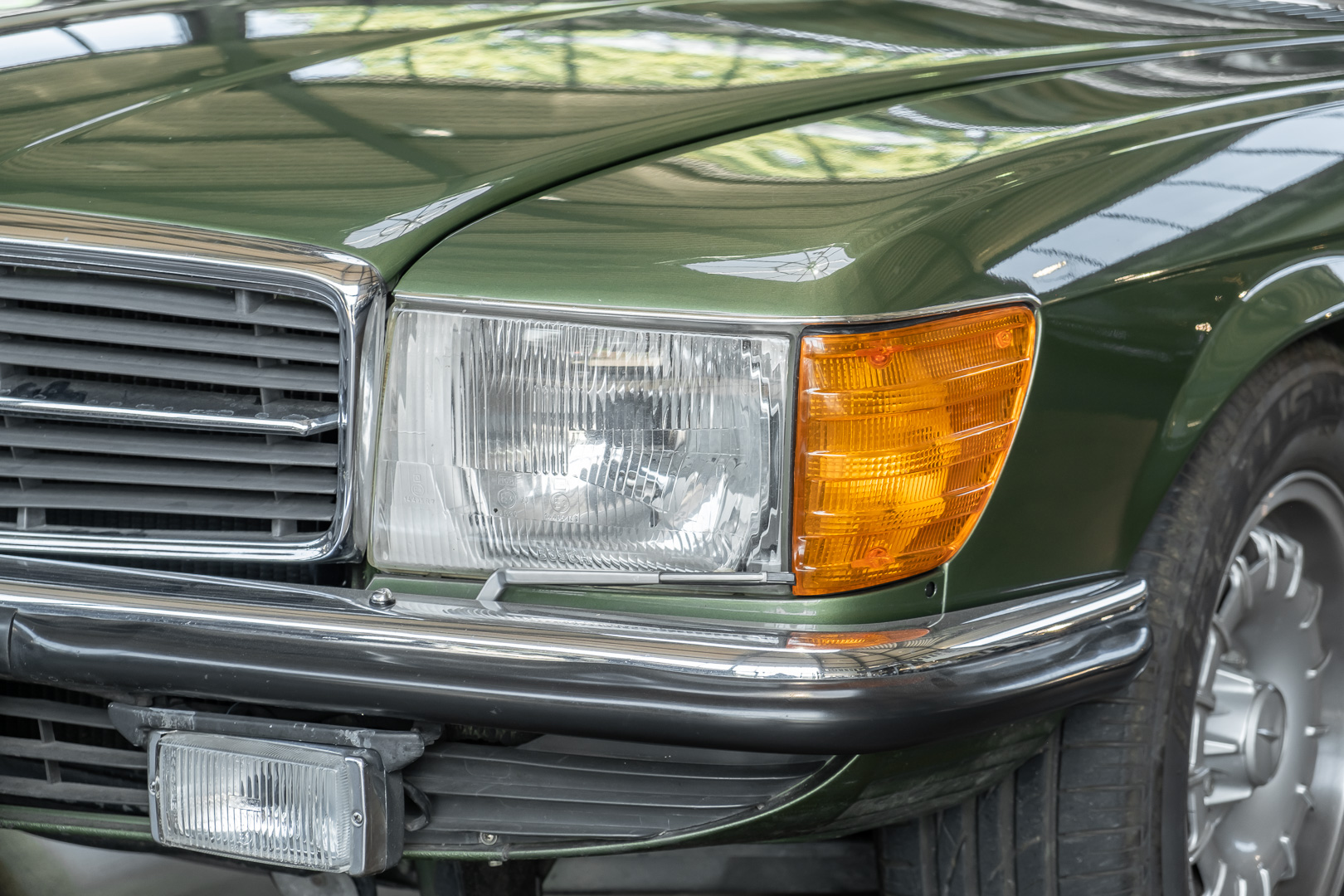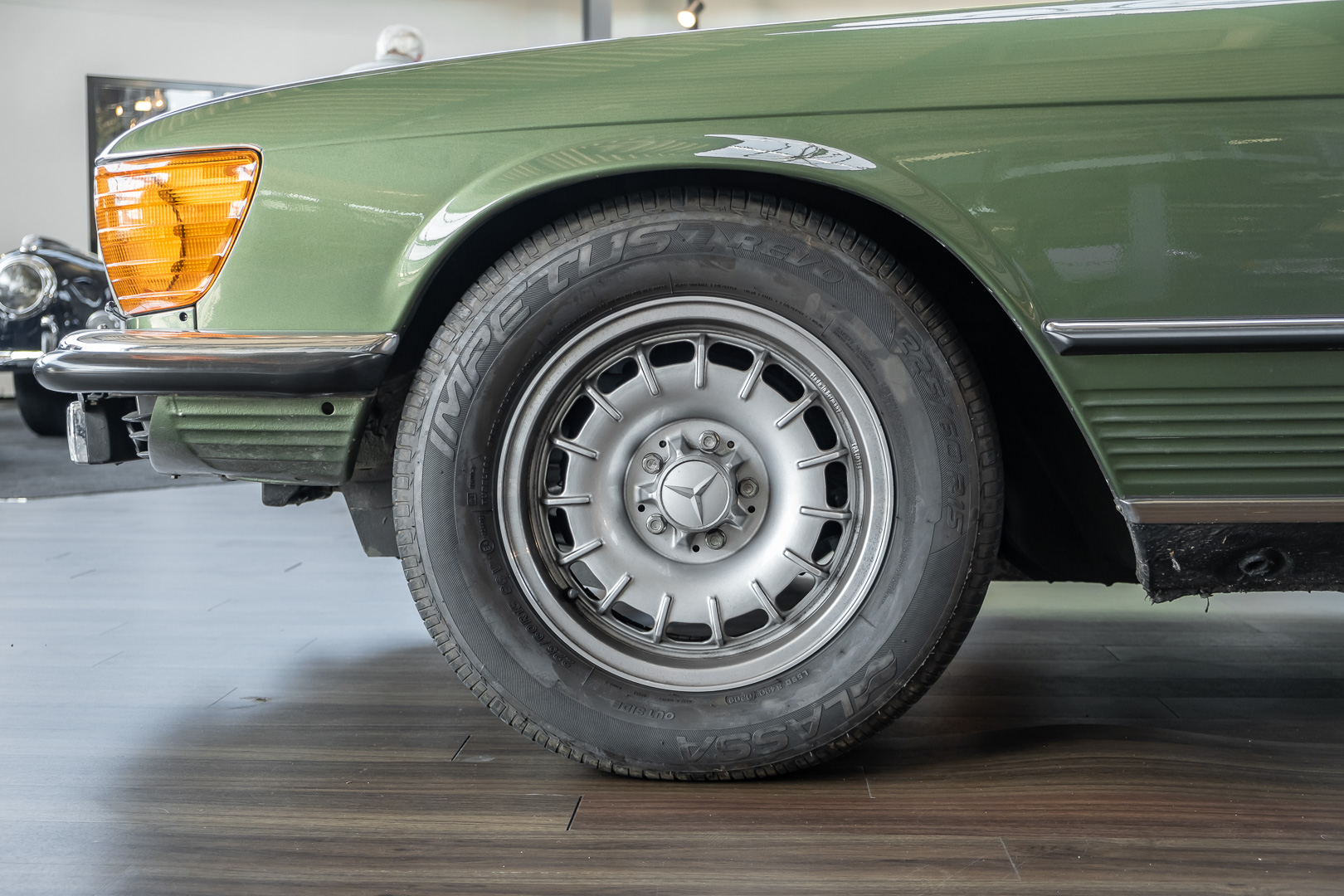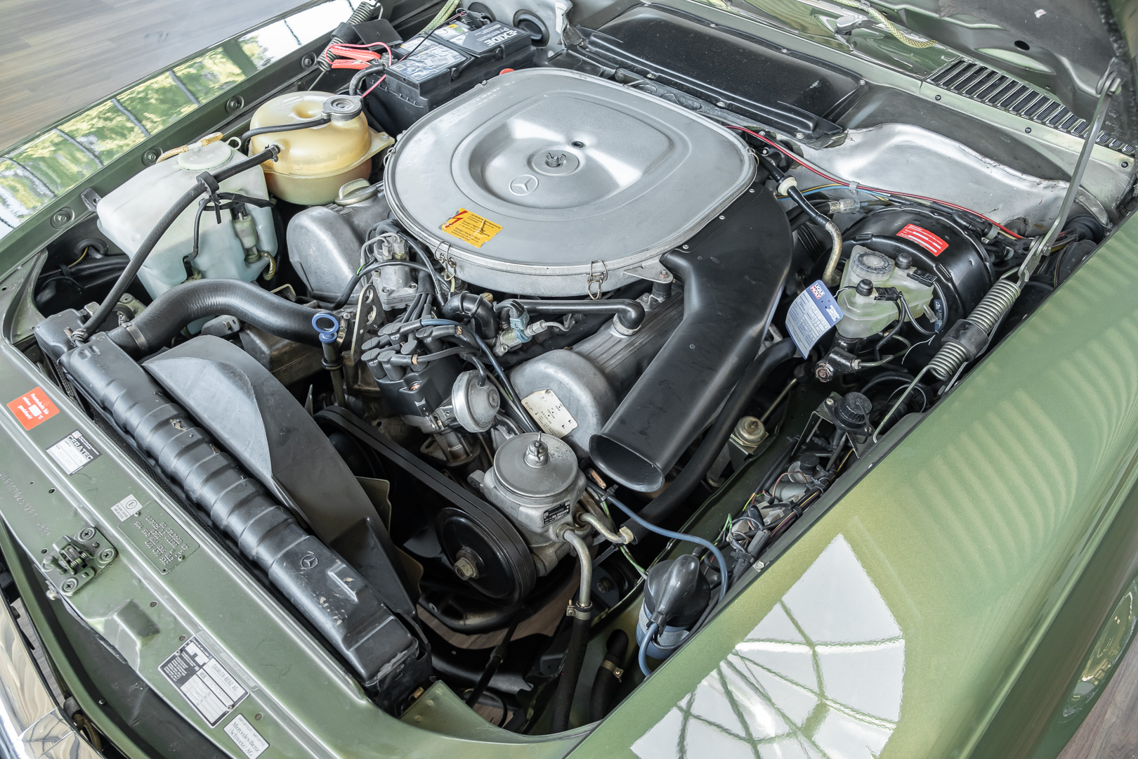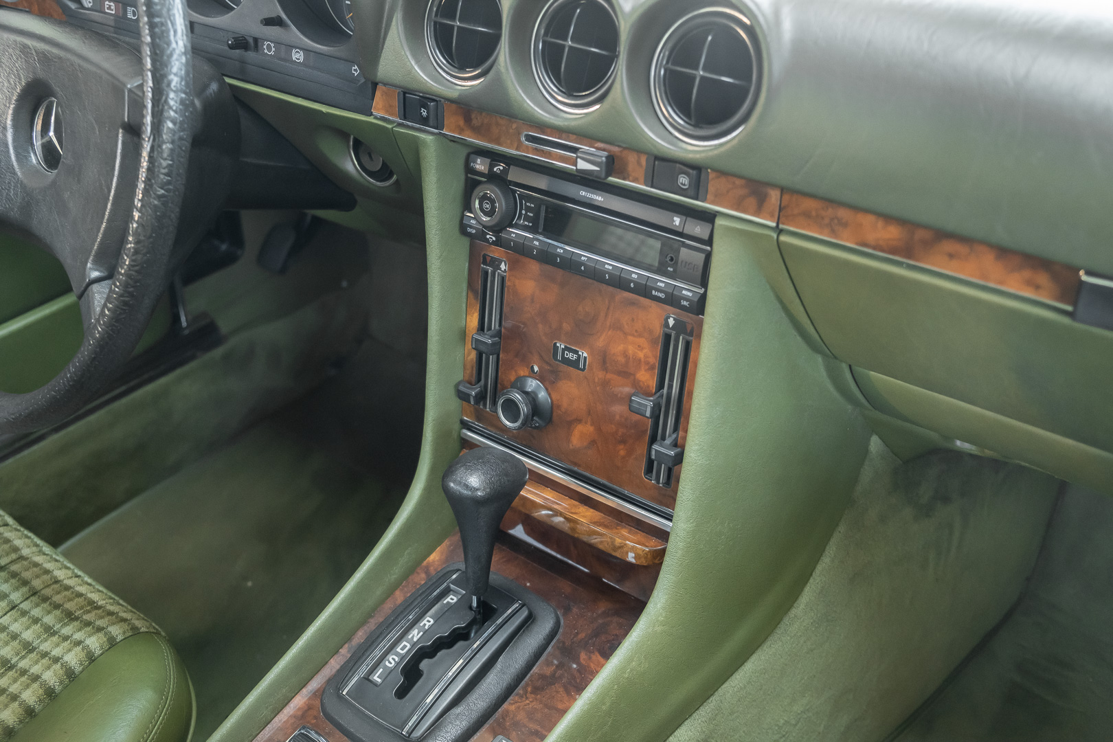 Ein automobiler Traum in Zypressengrün-metallic und der heute so gesuchten Stoff Karo Innenausstattung, passend in Olive, ist dieser Mercedes-Benz 380SLC aus der C107 Serie. Der Inhaber einer Rohrbiegerei im Schweizer Waengi, hatte sich in der Kreuzgarage Meggli in Elgg, seinen persönlichen Wunschtraum verwirklicht. Ein Mercedes-Benz Coupé mit kräftigem 8 Zylinder Motor, in seiner Lieblingsfarbe. Der Wagen bereitete ihm großen Fahrspaß. Er ließ jeden Kundendienst ausführen und jede Kleinigkeit sofort in Ordnung bringen. Es ist eine Freude das sorgfältig ausgefüllte Original Kundendienstscheckheft mit allen seinen Stempeln und Eintragungen zu lesen. Der Wagen blieb etwa 12 Jahre in der Schweiz. Im Mai 2013 kam das Coupé in eine zarte Damenhand im benachbarten Baden-Württemberg in Deutschland. Sein Weg führte es weiter über einen Besitzer in Schleswig-Holstein nach Braunschweig in Niedersachsen. Im Jahre 2017 konnten wir das Fahrzeug in eine Berliner Autosammlung verkaufen, aus dessen Besitz wir das Fahrzeug nun wieder anbieten düren. Der Pflegezustand des Wagens ist noch immer einmalig. Man sieht förmlich, dass er stets pfleglich behandelt und gewartet wurde. Die hohe Qualität der Lackierung zeigt, dass in jüngerer Zeit einmal eine fachmännische Überarbeitung stattfand. Die satte Farbe und der Tiefenglanz lassen das Coupé funkeln. Die Innenausstattung und die Technik zeigen sich von ihrer besten Seite. Eine Rarität, wie sie kaum zu finden ist. Es wurden nur 3.789 Fahrzeuge des 380 SLC gebaut, was ihn auch zu einem interessanten Sammlerobjekt macht.