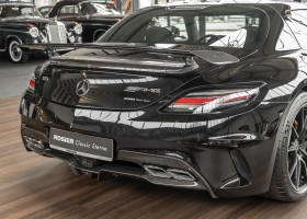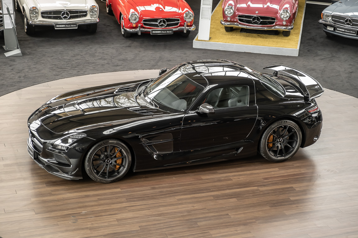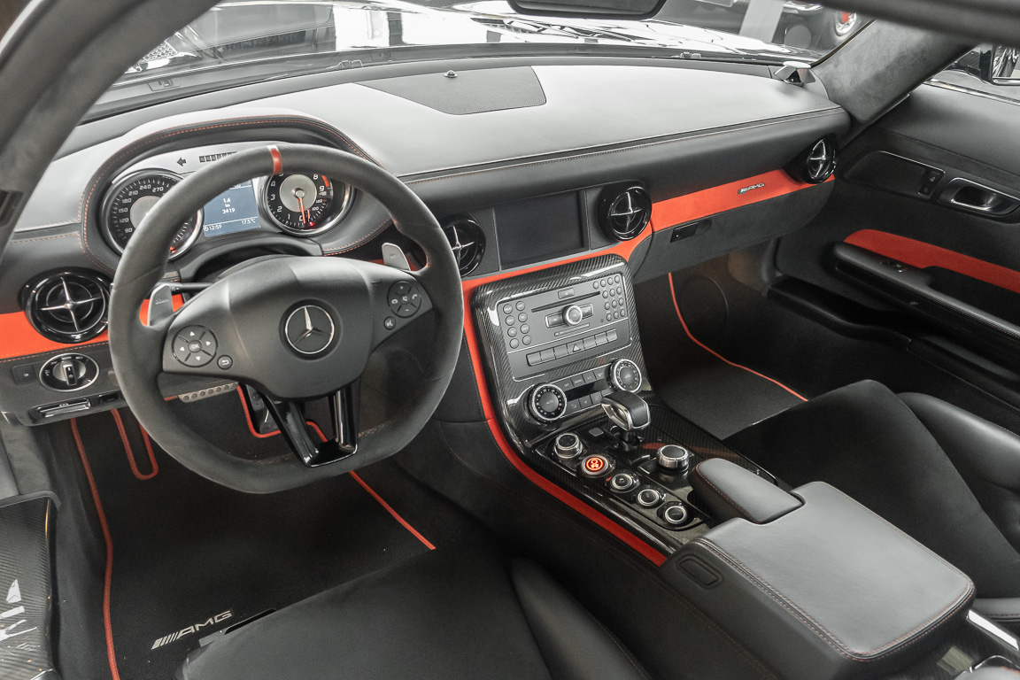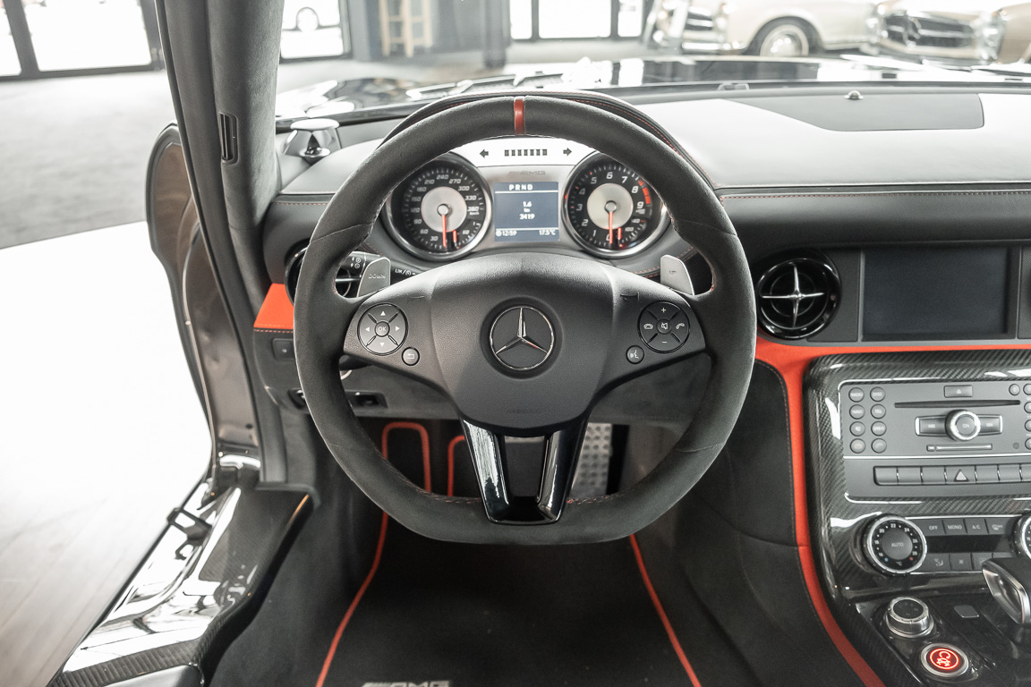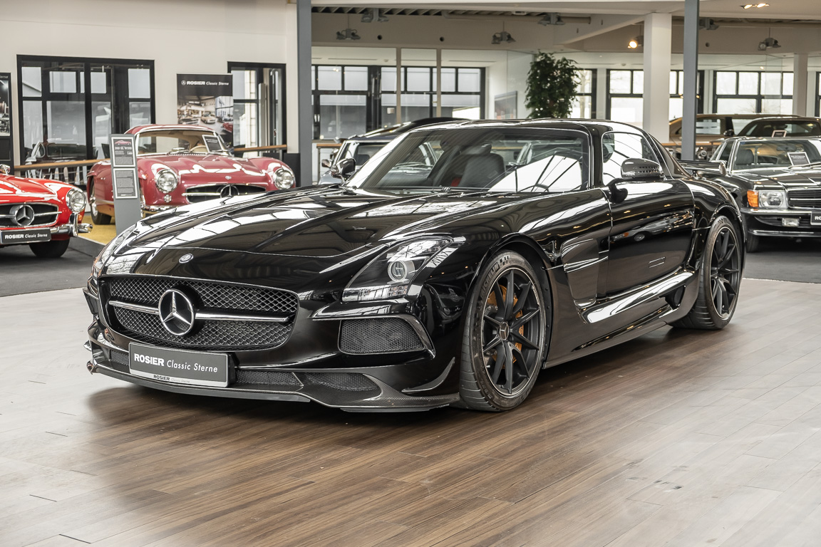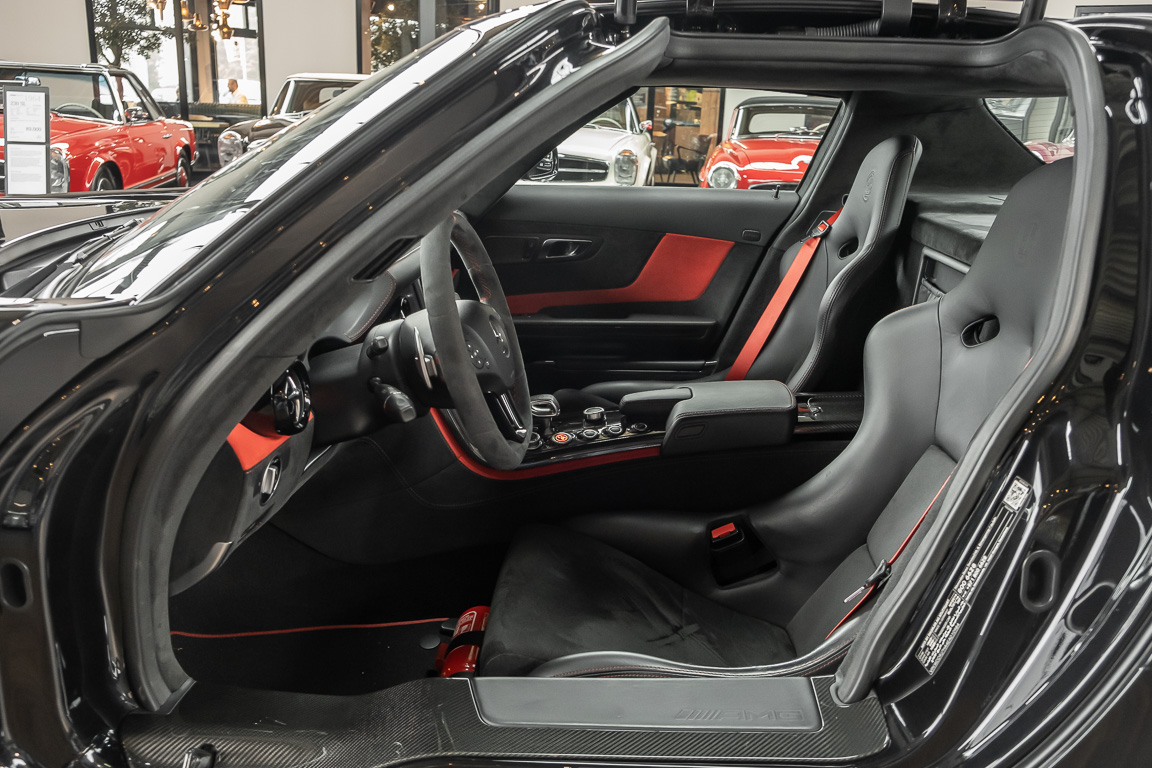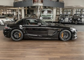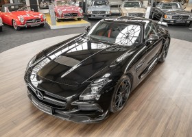 Wir freuen uns, Ihnen die nächste Flügeltür-Ikone nach dem legendären 300 SL anbieten zu können. Der Mercedes-Benz SLS AMG Black Series wurde in Kleinserie, in einer streng limitierten Auflage von 350 Fahrzeugen, aufgelegt und ist für Sammler weltweit ein hochinteressantes Schmuckstück. Mit 631 PS stellt der 6,3l-V8-Saugmotor nicht nur 60 PS mehr Leistung als der Serien SLS bereit, dank intelligentem Leichtbau sorgt der Black Series für Fahrperformance wie ein Rennfahrzeug. Zumindest in der Theorie. In der Praxis wurden die Black Series Modelle trotz Rennsportgenen durch rasant steigende Preise zumeist gelagert und kaum bewegt.