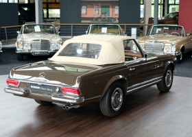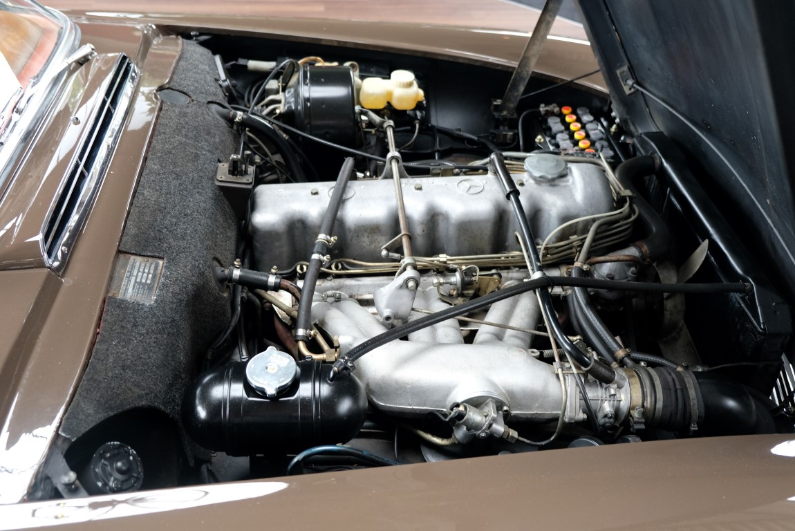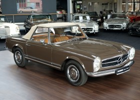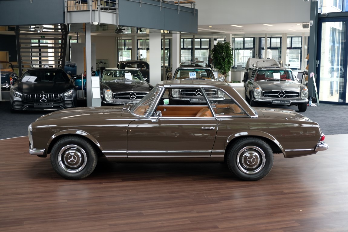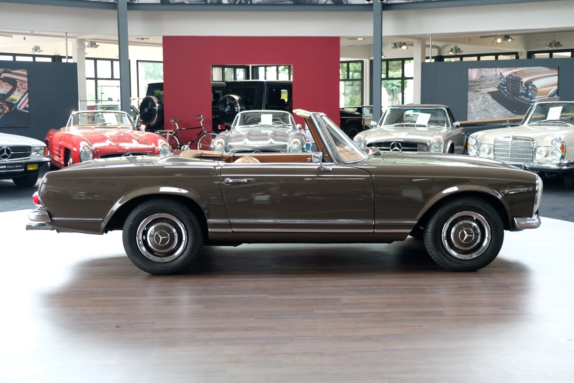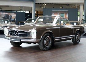 The 250 SL pagoda offered here was delivered on August 2, 1967 to a successful Dealer in Milan / Italy by the Mercedes-Benz Garage Genghini / Milano. The delivery color was Havana brown in conjunction with Havana-brown coupe roof and cognac-colored leather. Hard to beat in elegance was this color combination. The equipment included the very expensive 5-speed gearbox, which is still preserved today, as well as the original engine. The car remained for many years in sunny Italy and came in October 2013 in the possession of a doctor in Geneva / Switzerland. In 2016, the pagoda acquired a Mercedes-Benz partner from Germany and brought him back to his native country. Here he underwent the pagoda of a complex, expert restoration and put the car in its current state of . A pagoda right to drive and enjoy.