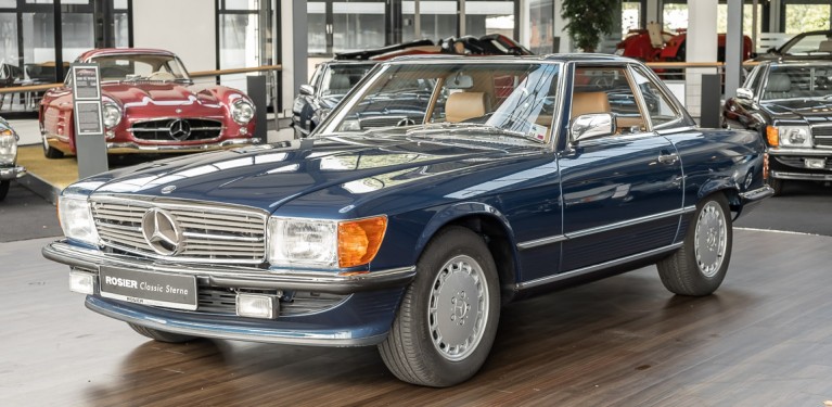 We are pleased to offer you this 560 SL of the 107 series. In the stylish color combination of a paint job in "nautical blue metallic" in combination with leather in the warm color "date", this car radiates a timeless appeal. While gliding effortlessly along with 230 hp in every situation, the driver experiences impeccable and well-maintained technology. Braking, accelerating, shifting: everything works as it should. The vehicle is handed over to its new owner with a fresh main inspection, an up-to-date service and a hardtop. An absolute delight to indulge in this roadster. "Experience" it for yourself. Welcome to ROSIER Classic Stars.