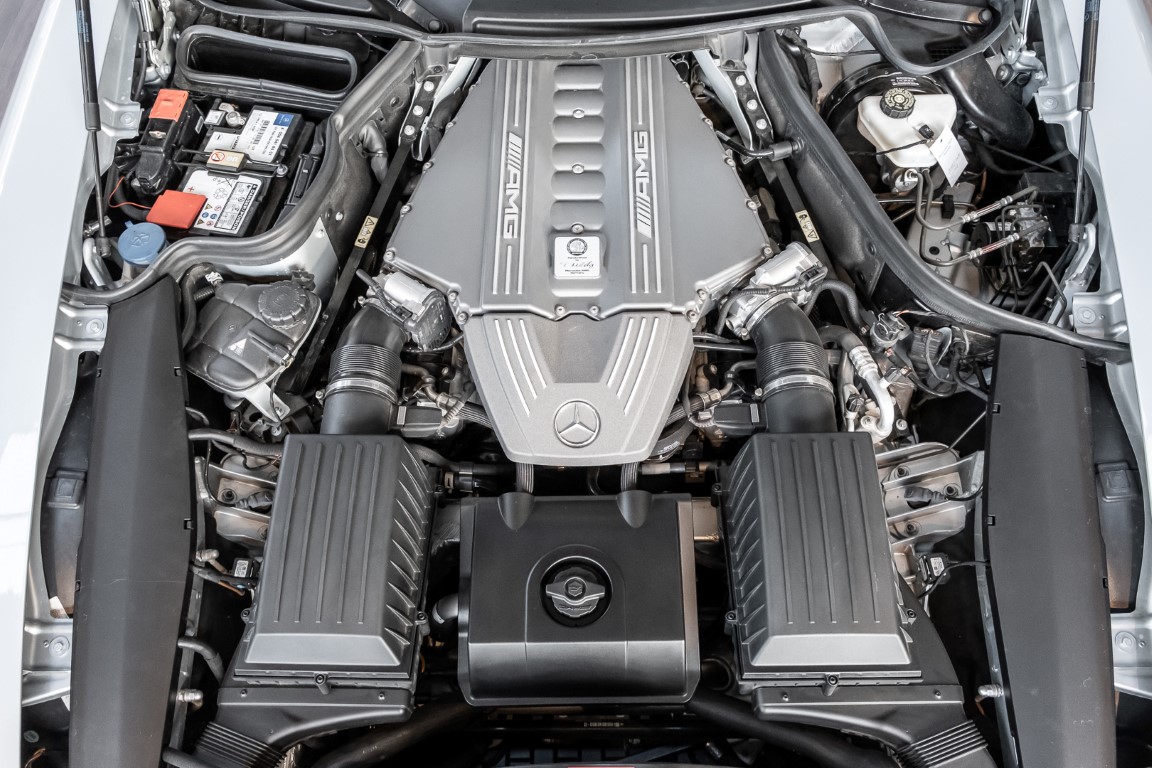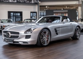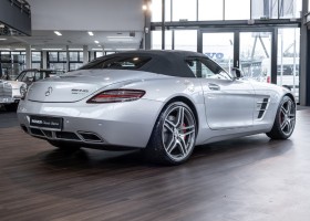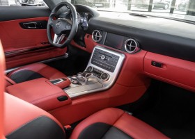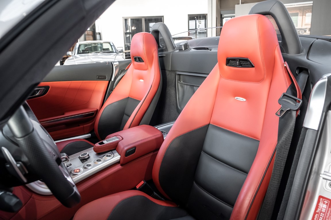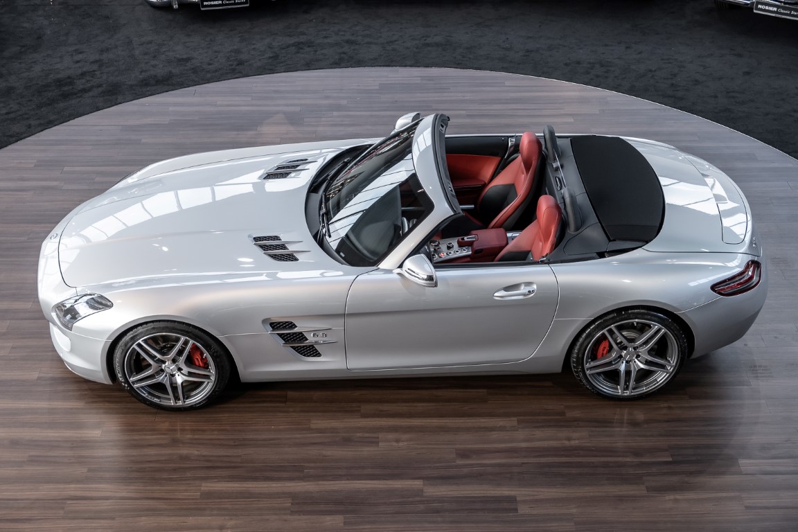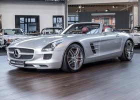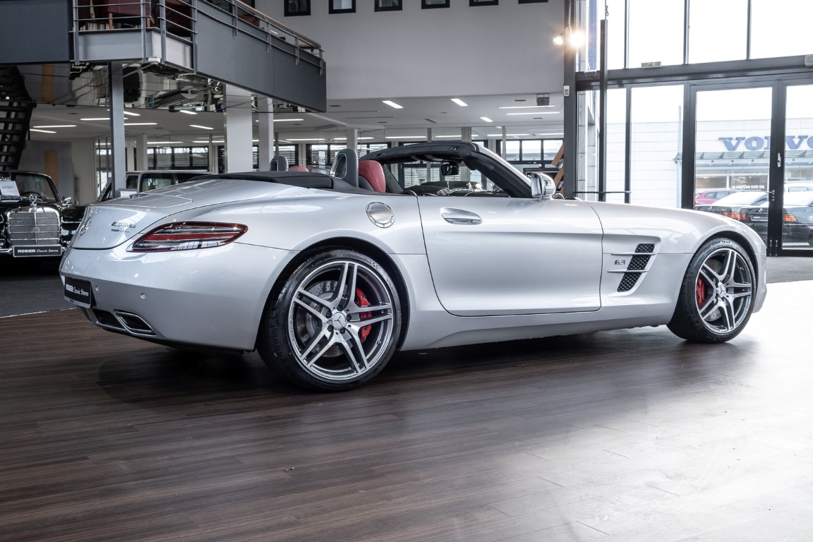 This wonderful SLS AMG Roadster in the classic-sporty combination "Iridium Silver Metallic" with red AMG Exclusive Leather is literally a Silver Arrow.